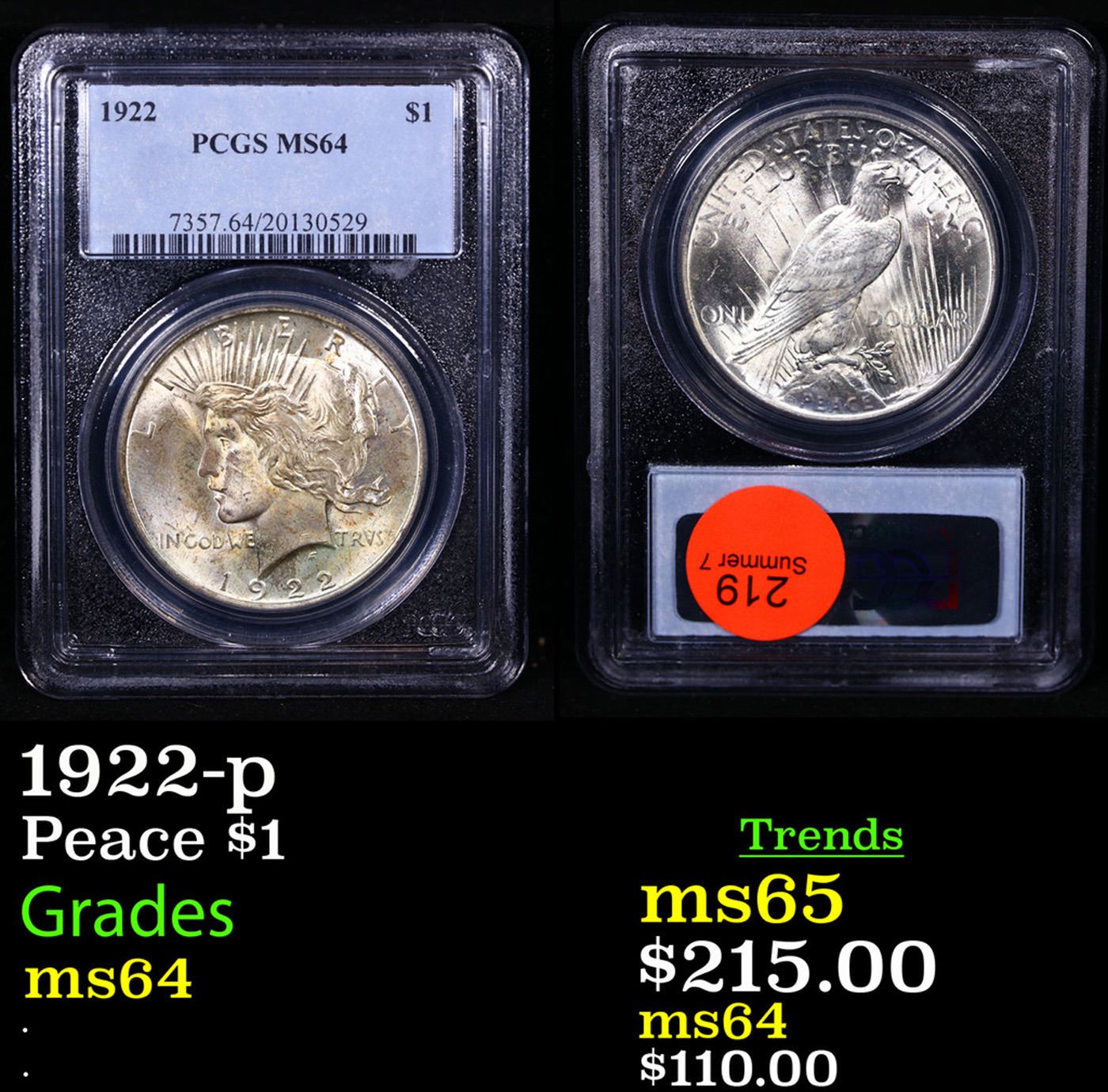 PCGS 1922-p Peace Dollar $1 Graded ms64 By PCGS.