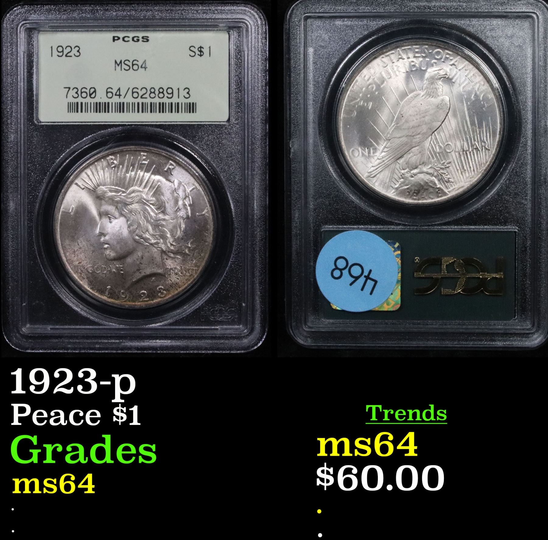 PCGS 1923-p Peace Dollar $1 Graded ms64 By PCGS.