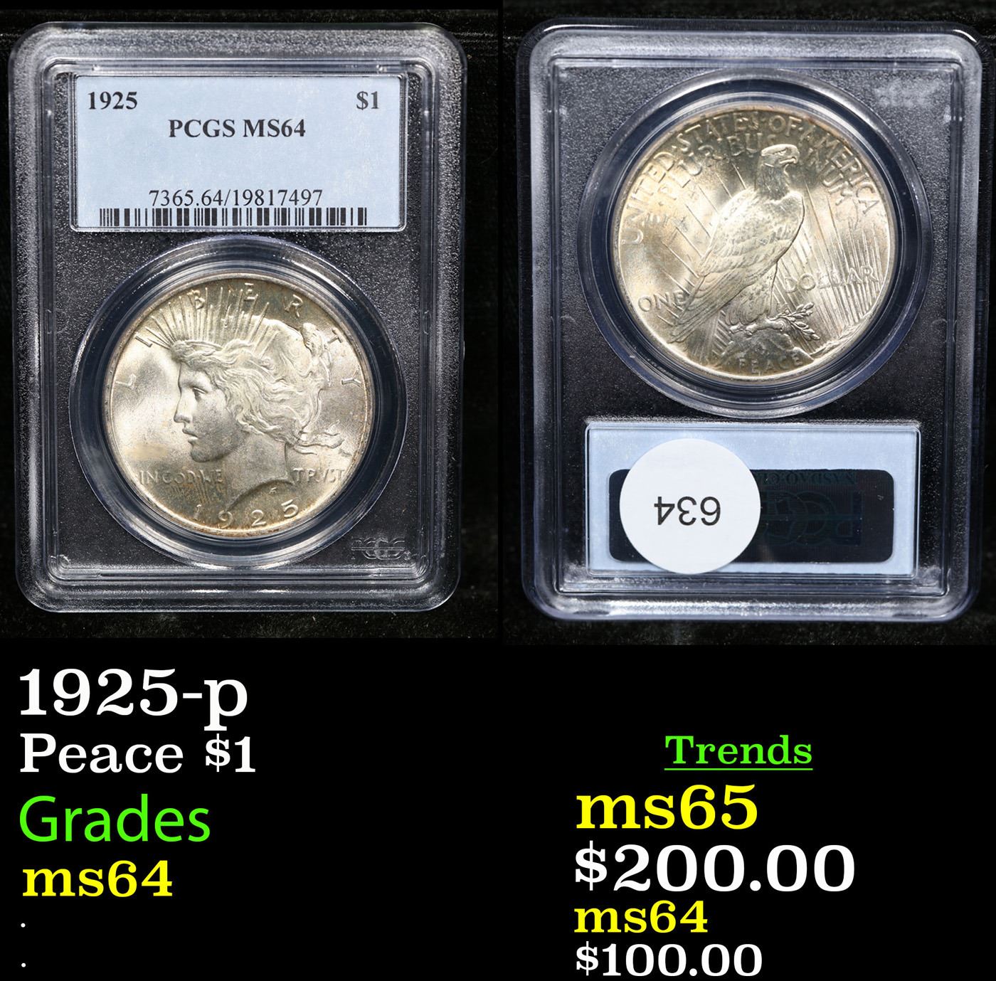 PCGS 1925-p Peace Dollar $1 Graded ms64 By PCGS.