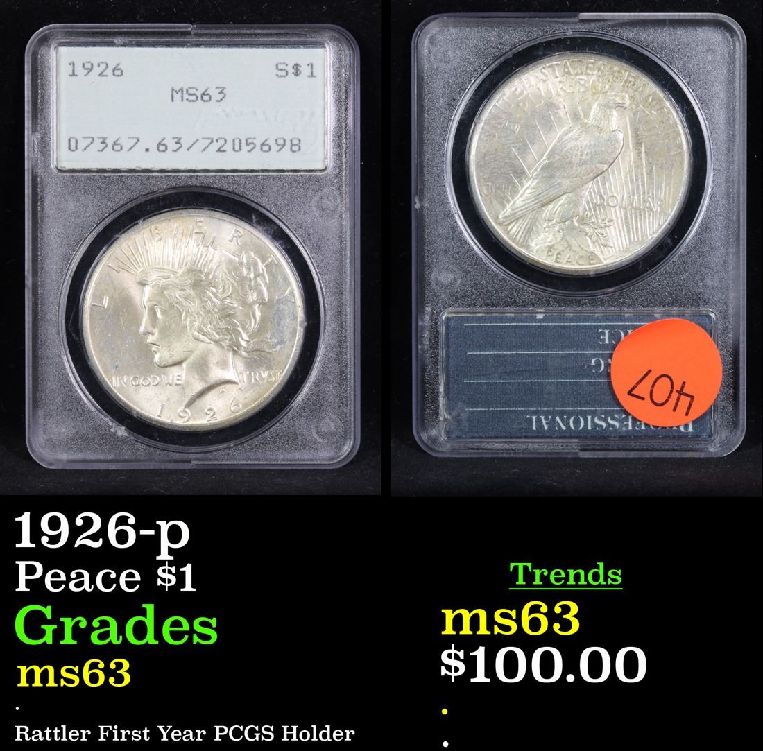 PCGS 1926-p Rattler First Year PCGS Holder . Peace Dollar $1 Graded ms63 By PCGS.