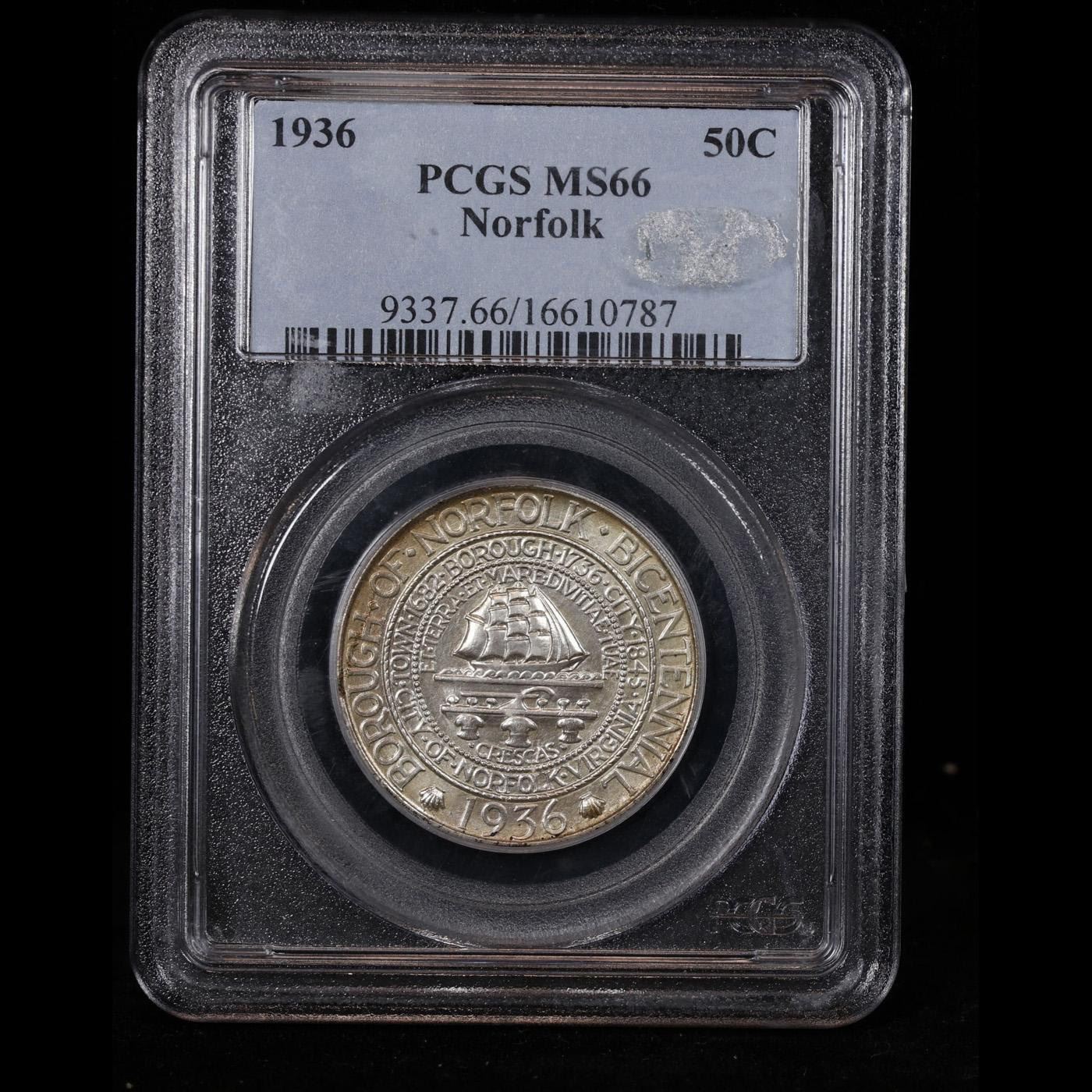 PCGS 1936 Norfolk Old Commem Half Dollar 50c Graded ms66 By PCGS. The 1936 Norfolk Bicentennial Half Dollar was issued to commemorate the 200th anniversary of the establishment of Norfolk, Virginia as a borough. Both the obverse and reverse of the coins carry incredibly voluminous number of inscriptions, which dominate the design.At the center of the obverse is a reproduction of the Norfolk City Seal, which carries a ship plow and stocks of grain. Inscriptions are placed in three concentric circles surrounding this image. The inscriptions read “Borough of Norfolk Bicentennial”, “1936”, “City of Norfolk Virginia”, “Town 1682”, “Borough 1736”, “City 1845”, “Et Terra Et Mare Divitiae Tuae” (Both by Land and by Sea Thy Riches Are), and “Crescas” (Thou Shalt Grow).The reverse carries an image of the Royal Mace of Norfolk, which was presented by Lieutenant Governor Dinwiddie in 1753. The date “1636” appears at center with two floral sprays. As with the obverse, many inscriptions surround, reading “United States of America”, “Half Dollar”, “Norfolk Virginia Land Grant”, “In God We Trust”, “E Pluribus Unum”, and “Liberty”. Designs for the coin were prepared by William Marks Simpson and Marjorie Emory Simpson.This Commemorative marked an event of purely local interest, and realized poor sales at the time of issue. In the irony that often accompanies such initial failure, it is now among the Scarcer and More Costly Coins in the old commemorative series. This bill authorized the coining of not more than 25,000 half dollars, to be coined at a single mint and with a single design. The entire mintage of 25,013 Norfolk halves was coined in September at the Philadelphia Mint (the odd 13 pieces were reserved for assay and later destroyed). Points to check f A Corey's Pick, Bid to Win, Don't let it get Away Coin