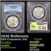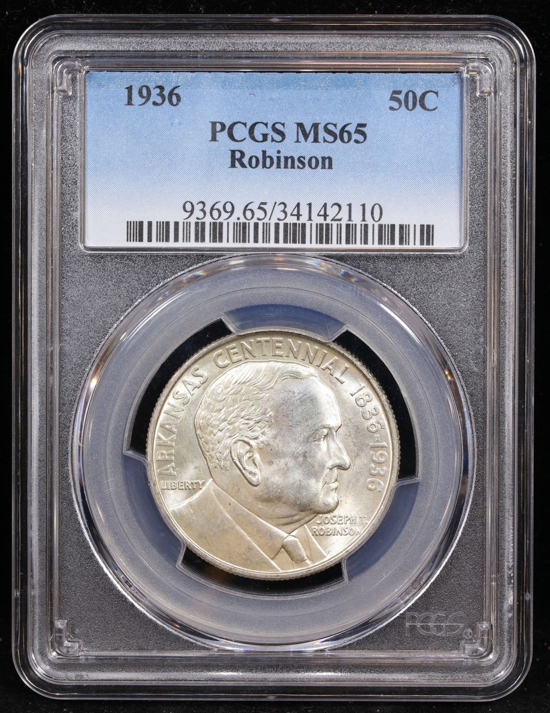 PCGS 1936 Robinson Old Commem Half Dollar 50c Graded ms65 By PCGS. The Robinson-Arkansas Commemorative was a much maligned Commemorative, this Issue is Nowadays Sought After as much as the others. The Issue is Generally Weakly Struck and has Luster which looks more Satin than Bright. When examining an Robinson-Arkansas for wear, check Miss Liberty’s Cheek and Wreath, also the Eagle’s Head and Right Wing - these are the High Points. The typical Robinson-Arkansas Half Dollar will show extensive contact marks and abrasions on the Senator’s face.
