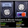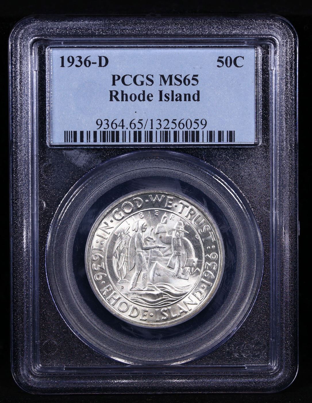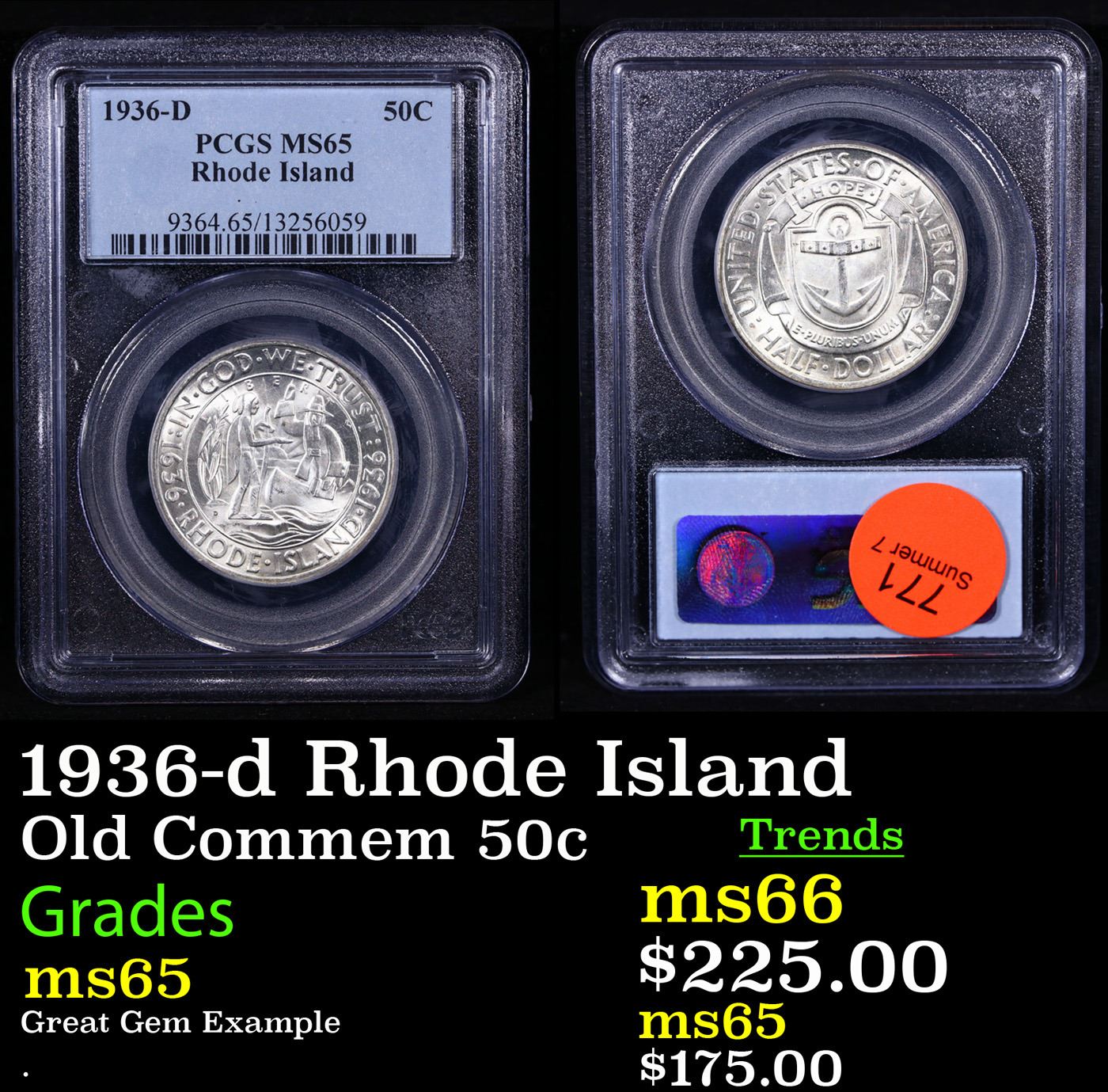 PCGS 1936-d Rhode Island Old Commem Half Dollar 50c Graded ms65 By PCGS. The commemorative coin most commonly referred to as the 1936 Rhode Island Tercentenary Half Dollar (Buy on eBay) was actually issued to mark the 300th anniversary of the founding of Providence by Roger Williams. The maximum authorized mintage was 50,000 pieces, of which the entire amount was produced across three mint facilities and distributed to the public.Designs for the coins were created by John Howard Benson and Arthur Graham Carey. Their original models did include reference to the Providence with inscriptions around the outer edge of the coin on the obverse “In a scene of God’s Merciful providence until me, called the place Providence” and on the reverse “State of Rhode Island and Providence Plantation Tercentenary”. These lengthy inscriptions were not used in the final version of the design.The obverse features a scene of John Williams in a canoe, holding a bible, and greeting a Native American who stands on the shore extending a hand. The “sun of religious liberty” appears in the background. The reverse design features an anchor and shield motif, adopted from the Rhode Island state seal. These designs were struck in low relief, but with sharply designed elements that resemble a woodcut.Including pieces struck for assay, the Philadelphia Mint produced 20,013, the Denver Mint 15,010, and the San Francisco Mint 15,011. The Rhode Island Half Dollars were issued for $1 each and said to have sold out quickly, however it was later suspected that some insiders held back portions of their allotments in order to sell them to the public at higher prices after the so-called sell out.Due to the nature of the design, contact marks may be prominent on the obverse and reverse. A small number of the coins are found with proof like surfaces, and these pieces command a premium.