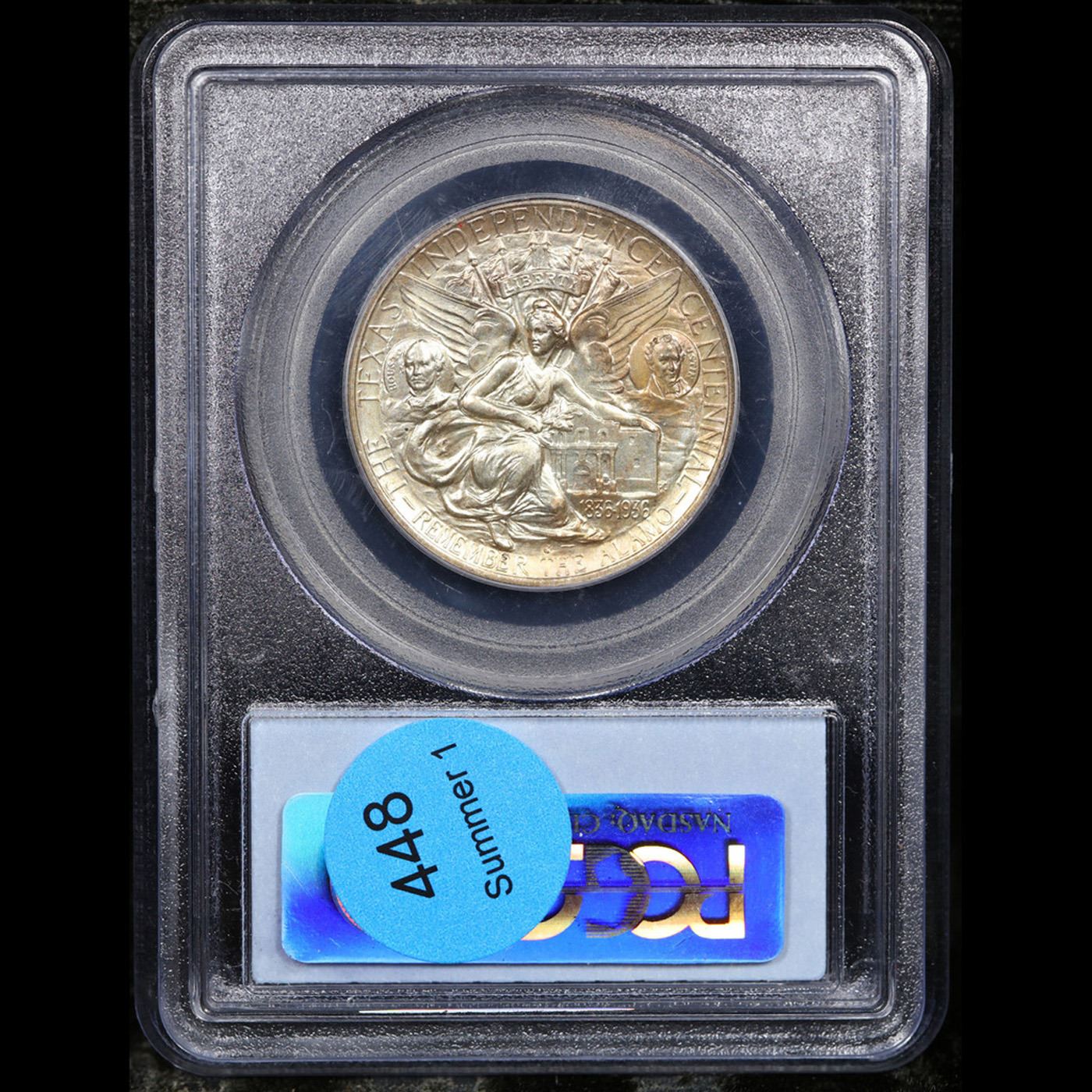 PCGS 1937-s Texas Old Commem Half Dollar 50c Graded ms65 By PCGS. The Texas Centennial half dollar commemorative coin was minted to honor the Centennial of Texas's independence from Mexico. Early in the administration of President Franklin Delano Roosevelt, on June 15, 1933, Congress passed an act to authorize the coinage of silver half dollars "in commemoration of the one hundredth anniversary in 1936 of the independence of Texas, and of the noble and heroic sacrifices of her pioneers, whose revered memory has been an inspiration to her sons and daughters during the past century." The Texas commemorative series ran from 1934 thru 1938 and 13 different dates and mint mark combinations were issued. For each of the years 1935 thru 1938, coins were struck at all three Mints; Philadelphia, Denver, and San Francisco. But for the 1934 Texas, only Philadelphia Mint coins were issued. The original issue price was $1.00 per coin.The coin was designed by Pompeo Coppini, a Texan. The obverse depicts an Eagle sitting on a branch in front of the Lone Star, the symbol of Texas. The reverse depicts the goddess Victory spreading her wings over the Alamo. It also depicts Sam Houston on her left and Stephen F. Austin on her right. The Six Flags of Texas fly above her head. Under her it reads REMEMBER THE ALAMO. Over Sam Houston, Victory, and Stephen F. Austin it reads THE TEXAS INDEPENDENCE CENTENNIAL.