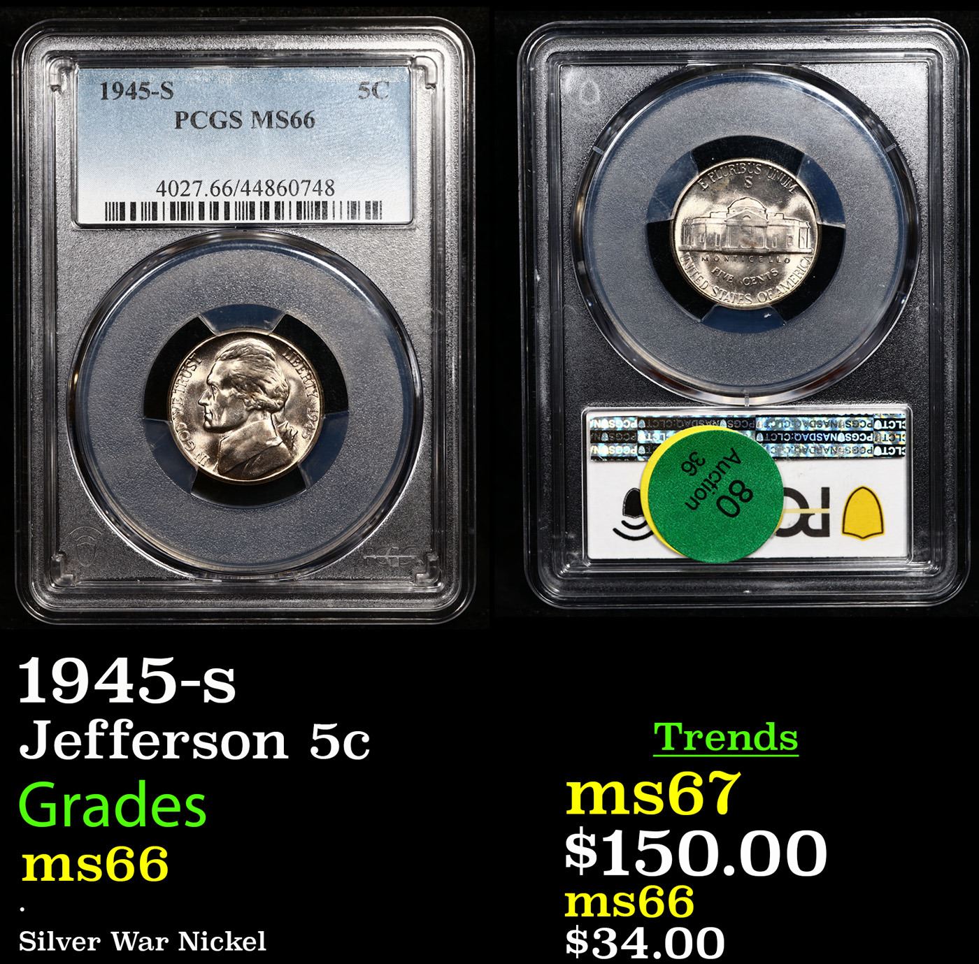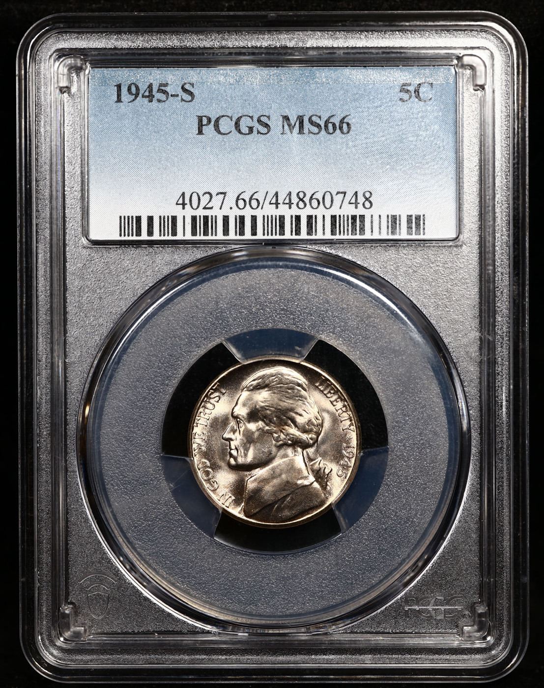 PCGS 1945-s Jefferson Nickel 5c Graded ms66 BY PCGS.