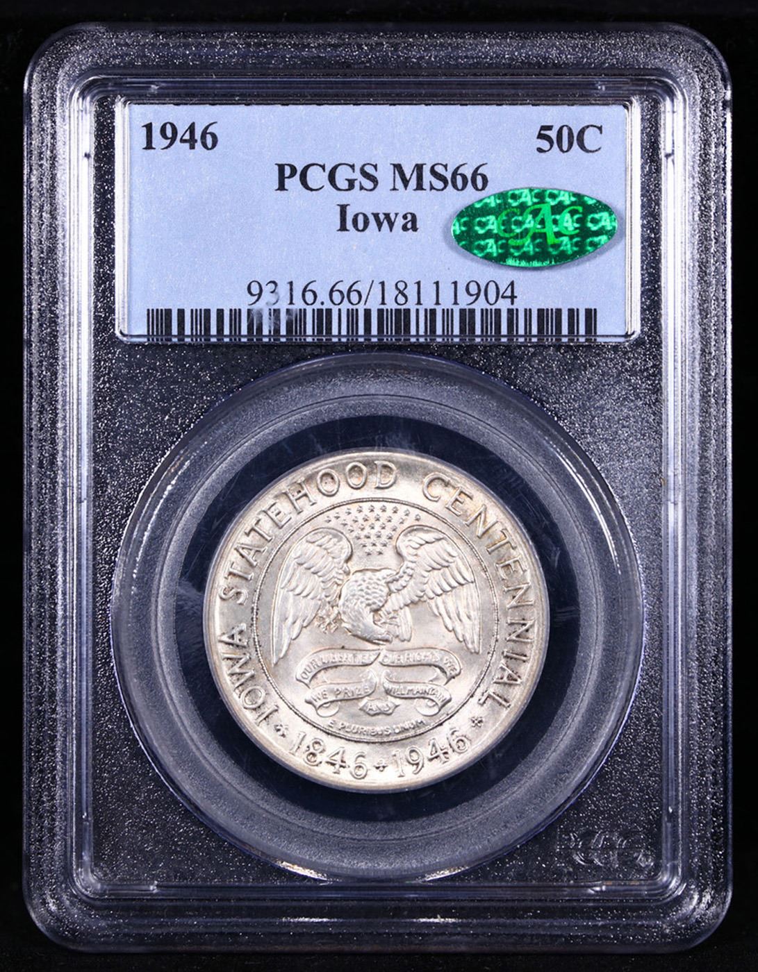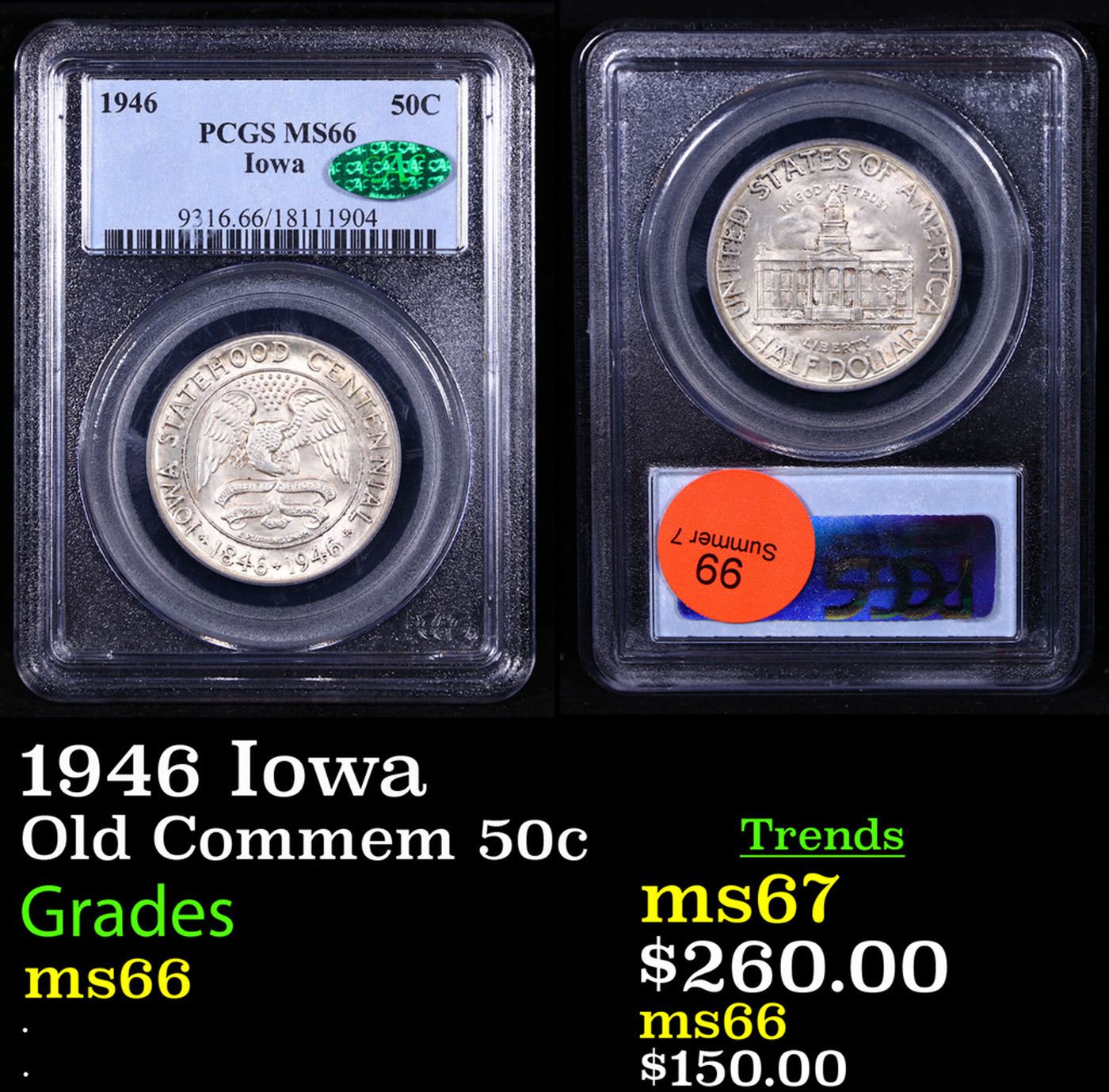PCGS 1946 Iowa CAC Old Commem Half Dollar 50c Graded ms66 By PCGS. The Iowa Commemorative marks the Final Run of the Old US Commemorative Program. The Iowa and the Booker T. Washington were approved on the same day by President Truman and mark an End to the Program. When looking at an Iowa Commemorative, check for signs of wear on the Eagle’s Neck and Head, and on the Building’s Central Pillars.
