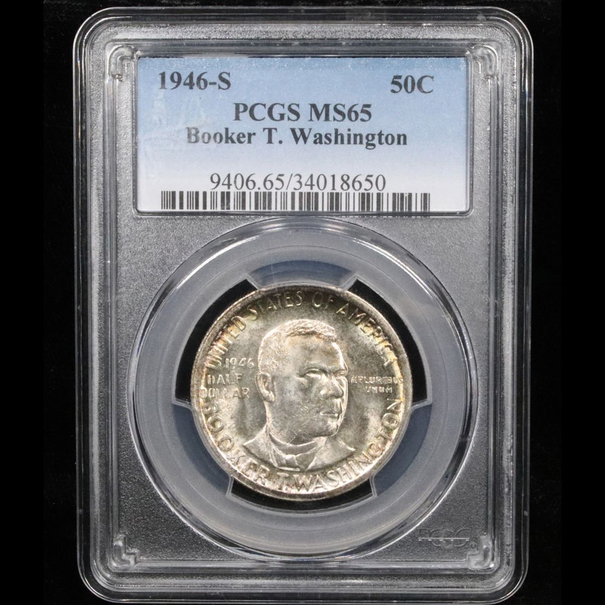 PCGS 1946-s BTW . Great Gem Example Old Commem Half Dollar 50c Graded ms65 By PCGS. When examining a Booker T. Washington commemorative look for wear on the high points, on the obverse that is Mr. Washington's right Cheek (from his perspective), and on the reverse the arches on the top building.