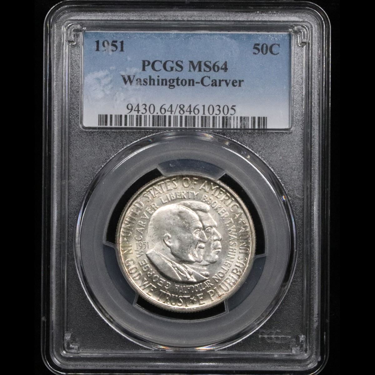 PCGS 1951-p Wash/Car . . Old Commem Half Dollar 50c Graded ms64 by PCGS. The Final Coin in the Old Commemorative Program. It was Minted to Revive the Ending Booker T Washington Commemorative and to Honor Washington Carver. When examining a Wash/Carver examine the High Points, which are Carver's cheek on the Obverse and the Center of the USA on the Reverse.
