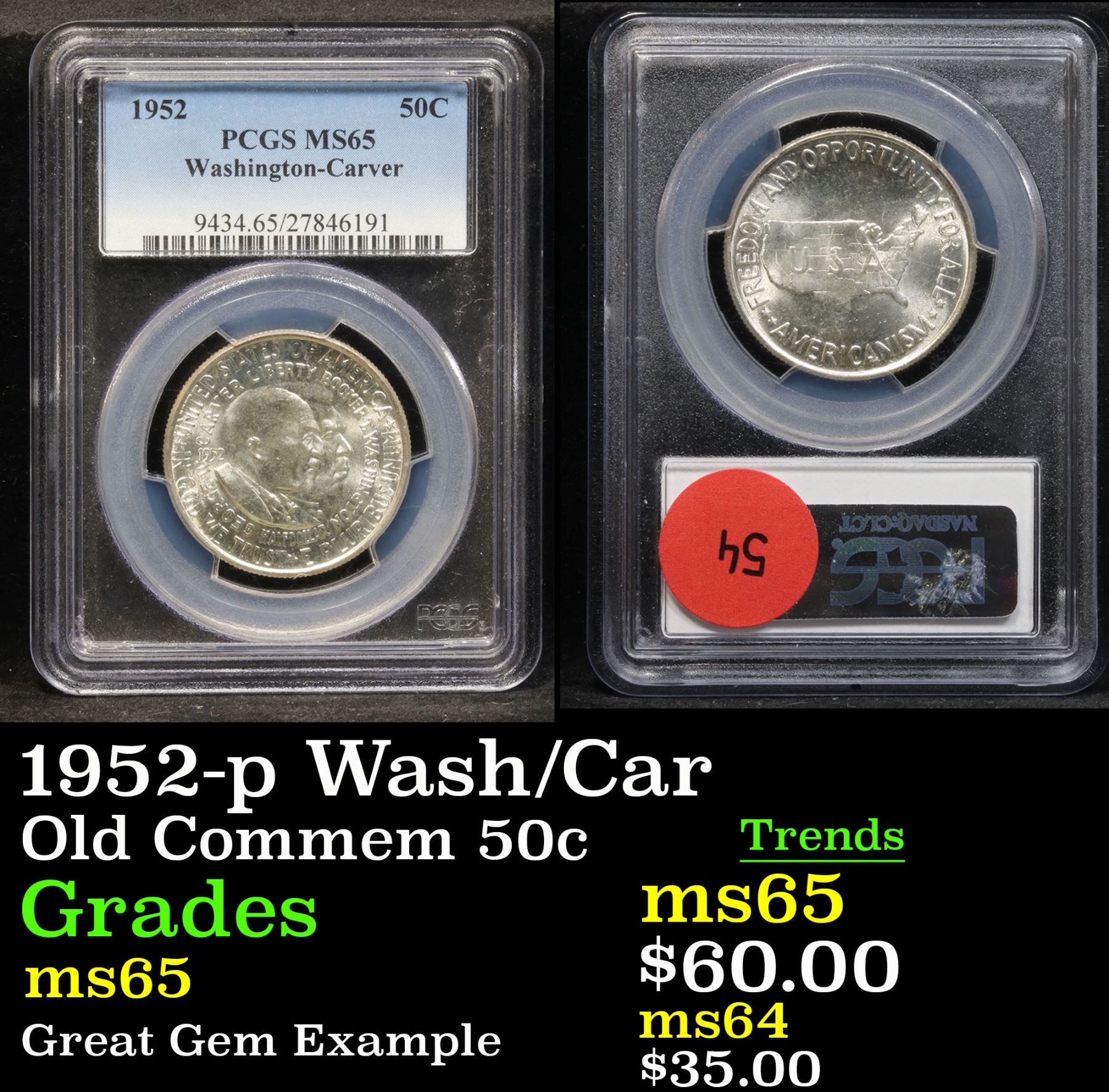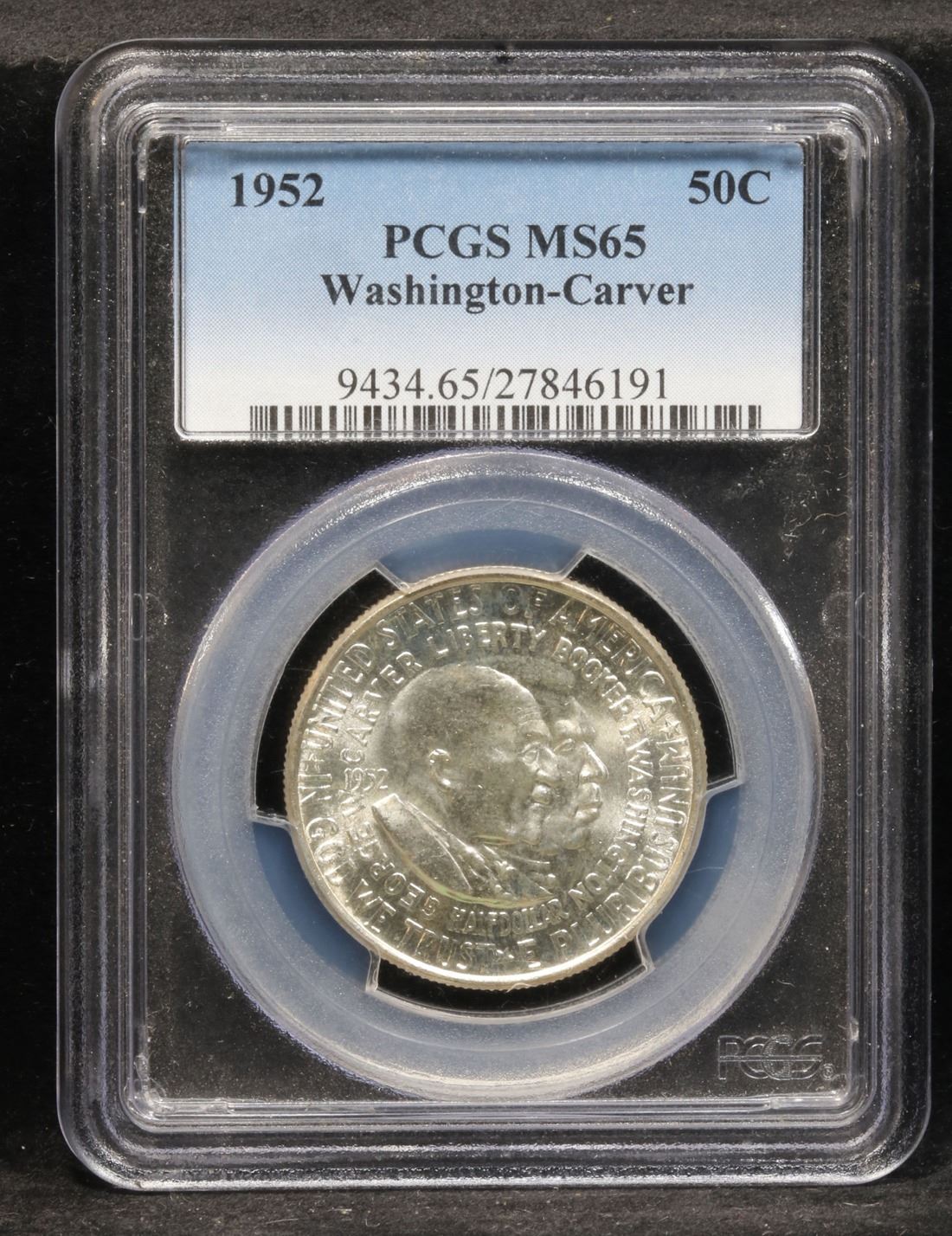 PCGS 1952-p Wash/Car . Great Gem Example Old Commem Half Dollar 50c Graded ms65 By PCGS. The Final Coin in the Old Commemorative Program. It was Minted to Revive the Ending Booker T Washington Commemorative and to Honor Washington Carver. When examining a Wash/Carver examine the High Points, which are Carver's cheek on the Obverse and the Center of the USA on the Reverse.
