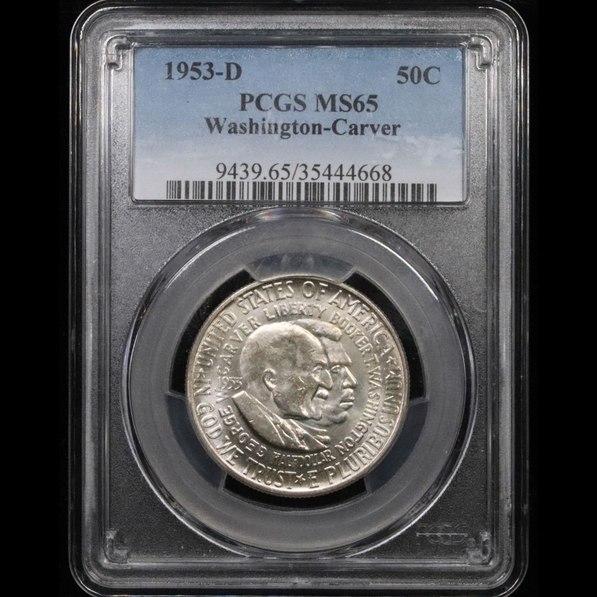 PCGS 1953-d Wash/Car . Great Gem Example Old Commem Half Dollar 50c Graded ms65 By PCGS. The Final Coin in the Old Commemorative Program. It was Minted to Revive the Ending Booker T Washington Commemorative and to Honor Washington Carver. When examining a Wash/Carver examine the High Points, which are Carver's cheek on the Obverse and the Center of the USA on the Reverse.
