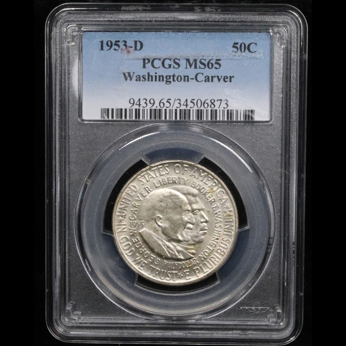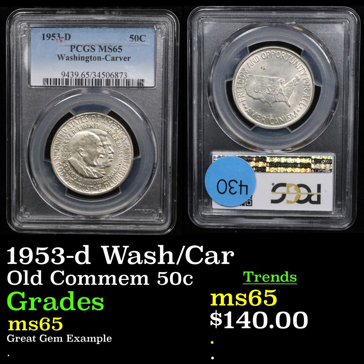 PCGS 1953-d Wash/Car . Great Gem Example Old Commem Half Dollar 50c Graded ms65 By PCGS. The Final Coin in the Old Commemorative Program. It was Minted to Revive the Ending Booker T Washington Commemorative and to Honor Washington Carver. When examining a Wash/Carver examine the High Points, which are Carver's cheek on the Obverse and the Center of the USA on the Reverse.