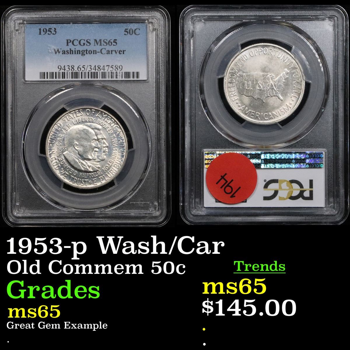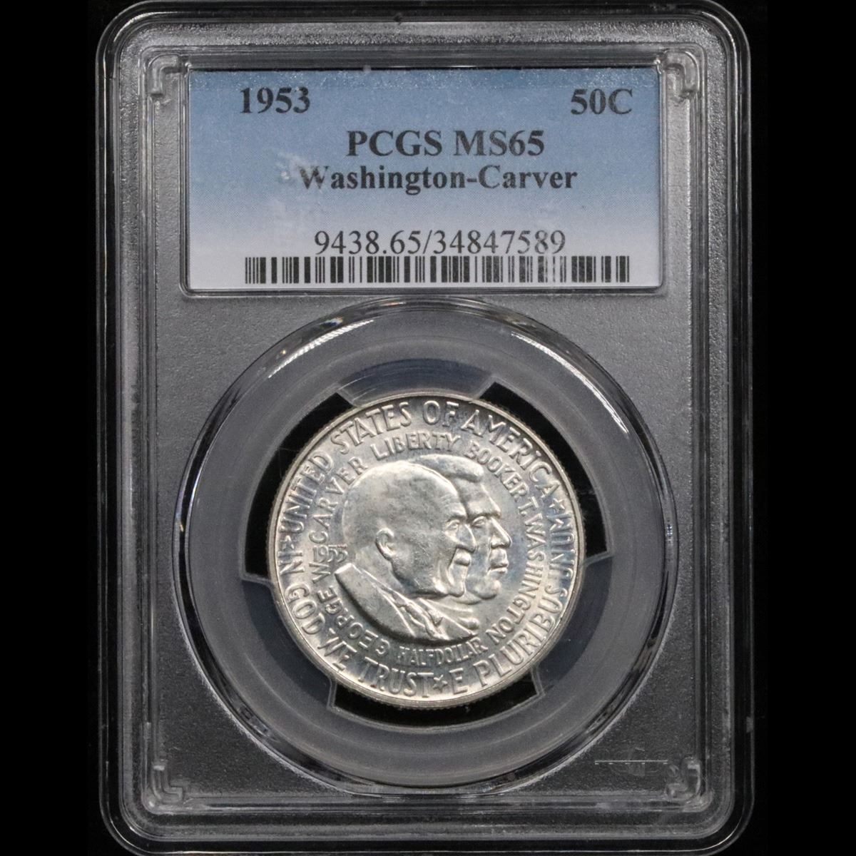 PCGS 1953-p Wash/Car . Great Gem Example Old Commem Half Dollar 50c Graded ms65 by PCGS. The Final Coin in the Old Commemorative Program. It was Minted to Revive the Ending Booker T Washington Commemorative and to Honor Washington Carver. When examining a Wash/Carver examine the High Points, which are Carver's cheek on the Obverse and the Center of the USA on the Reverse.