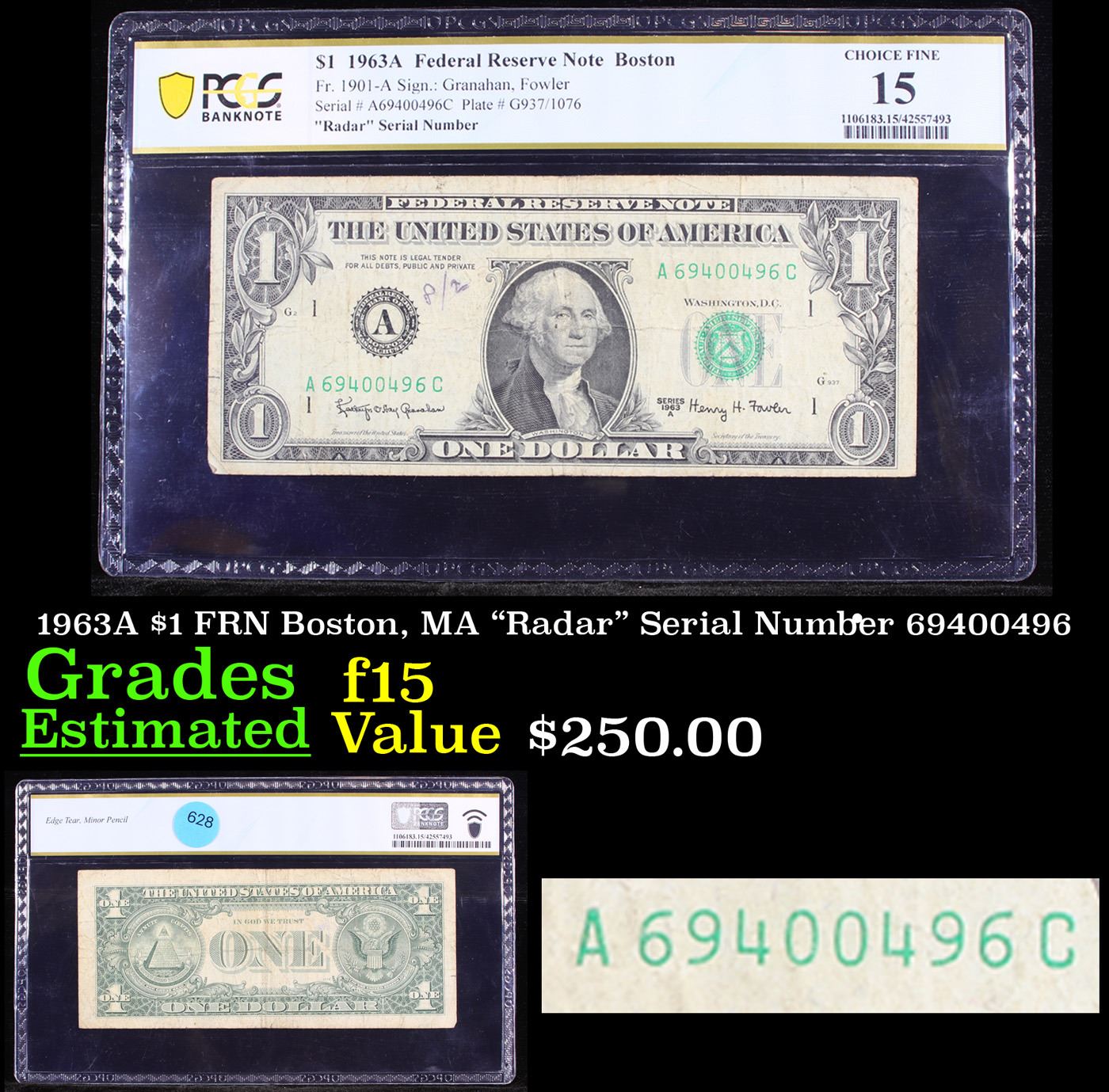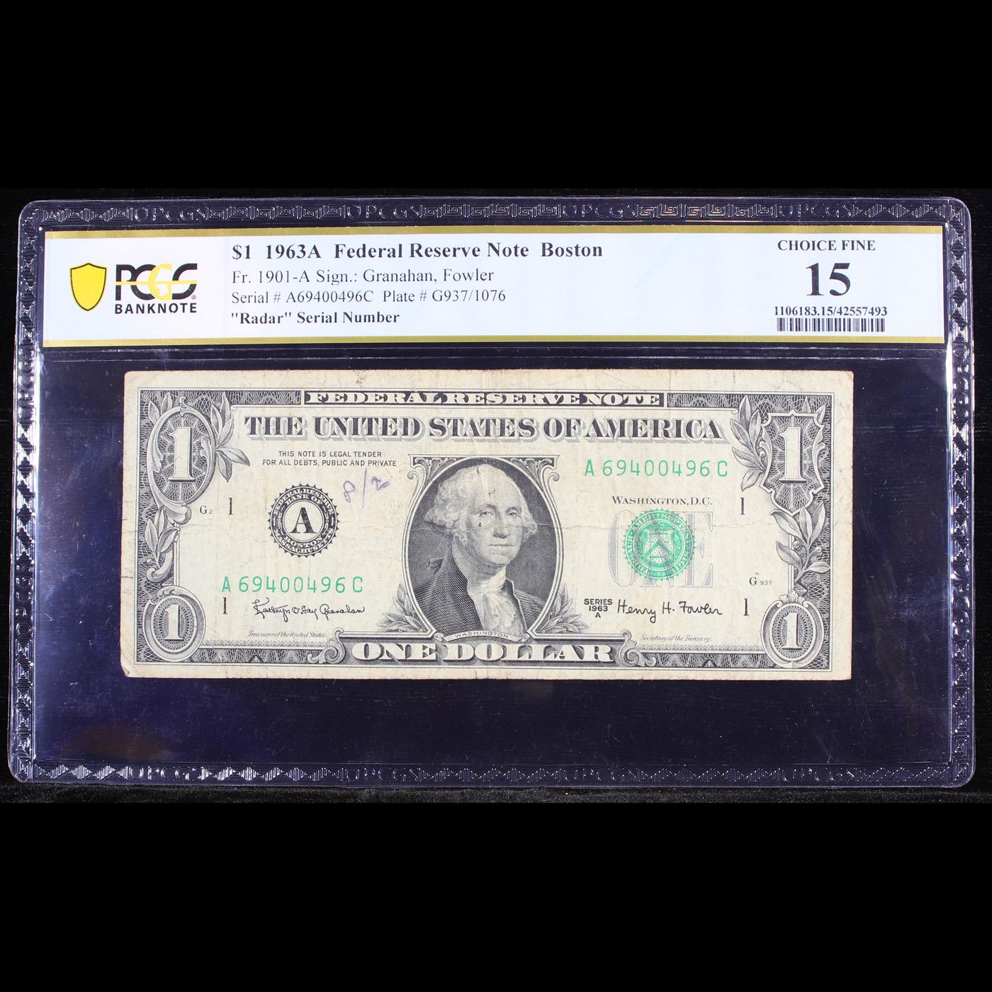 PCGS 1963A $1 FRN Boston, MA "Radar" Serial Number 69400496 Graded f15 By PCGS.