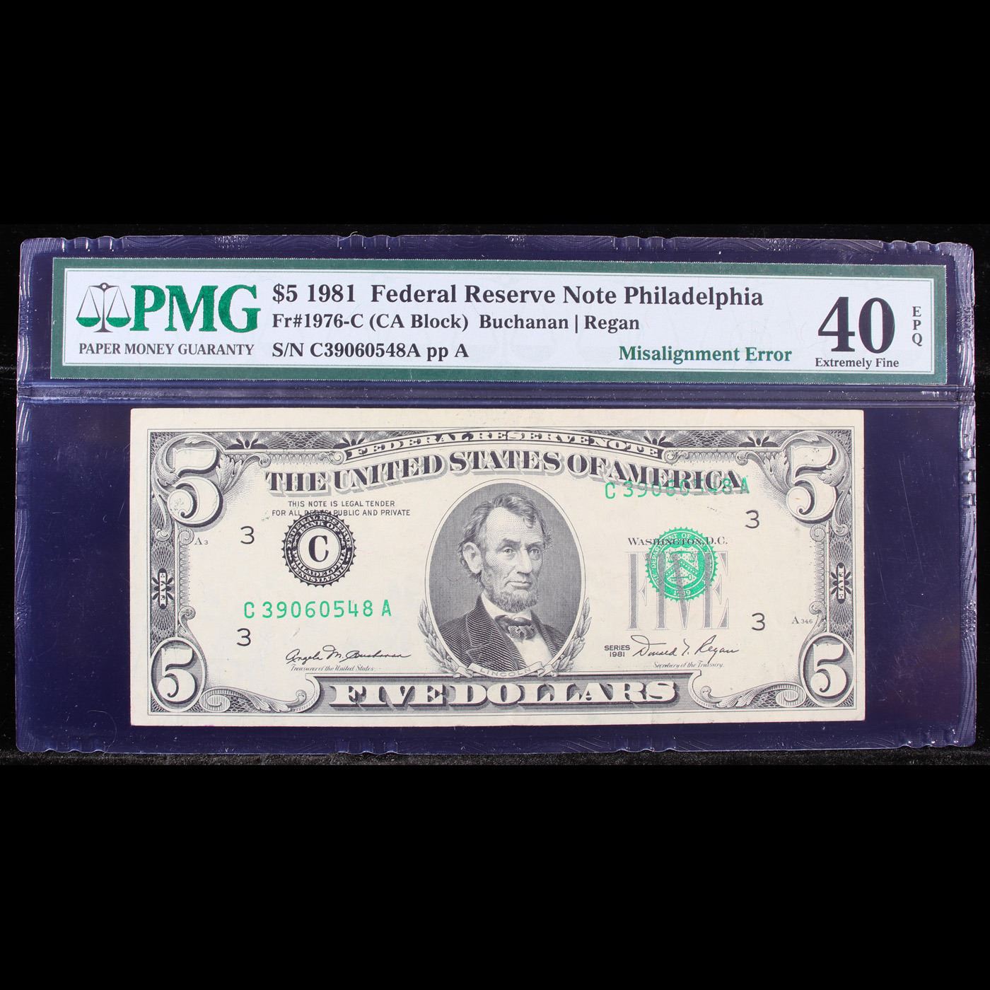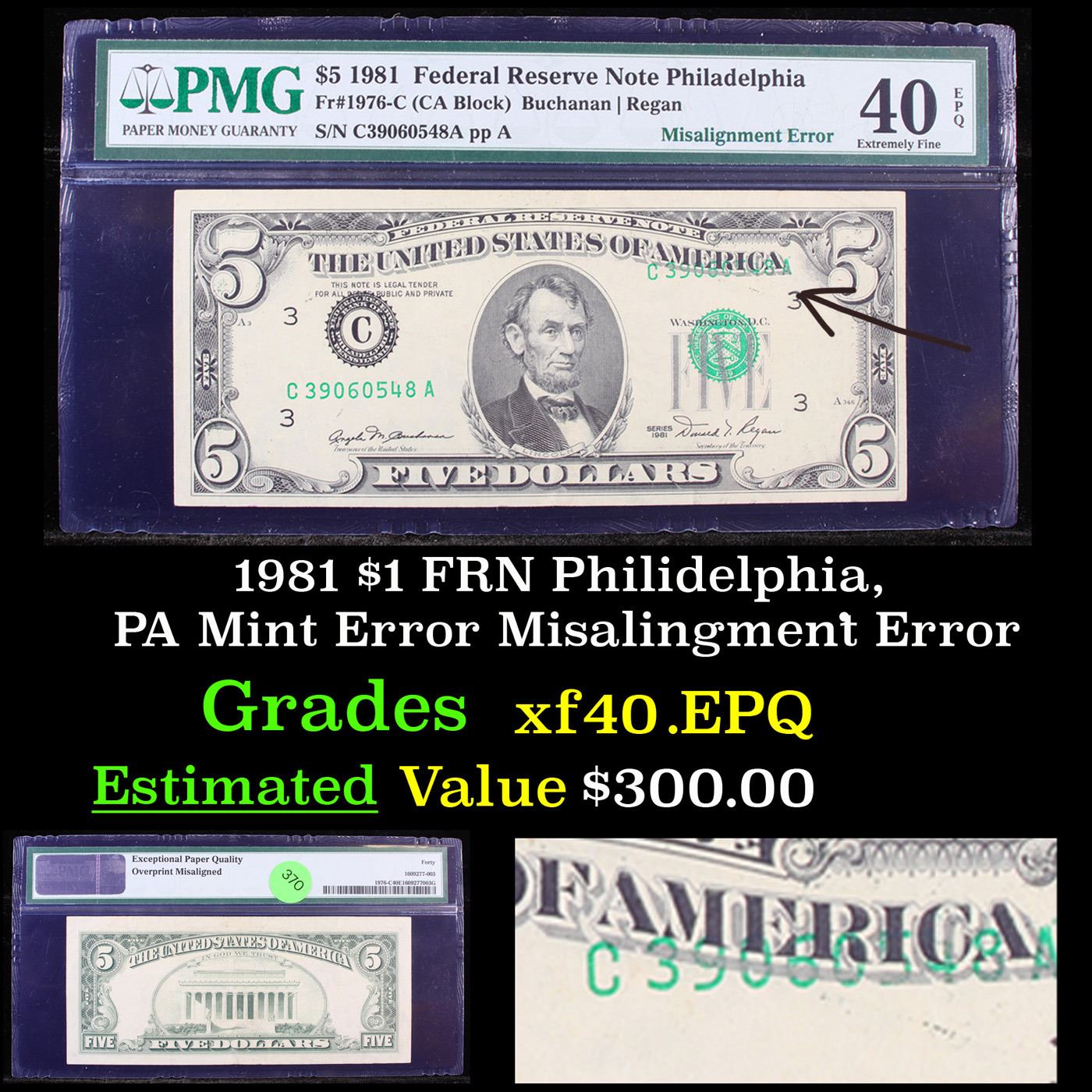 PCGS 1981 $5 FRN Philidelphia, PA Mint Error Misalingment Error Graded xf40 EPQ By PCGS