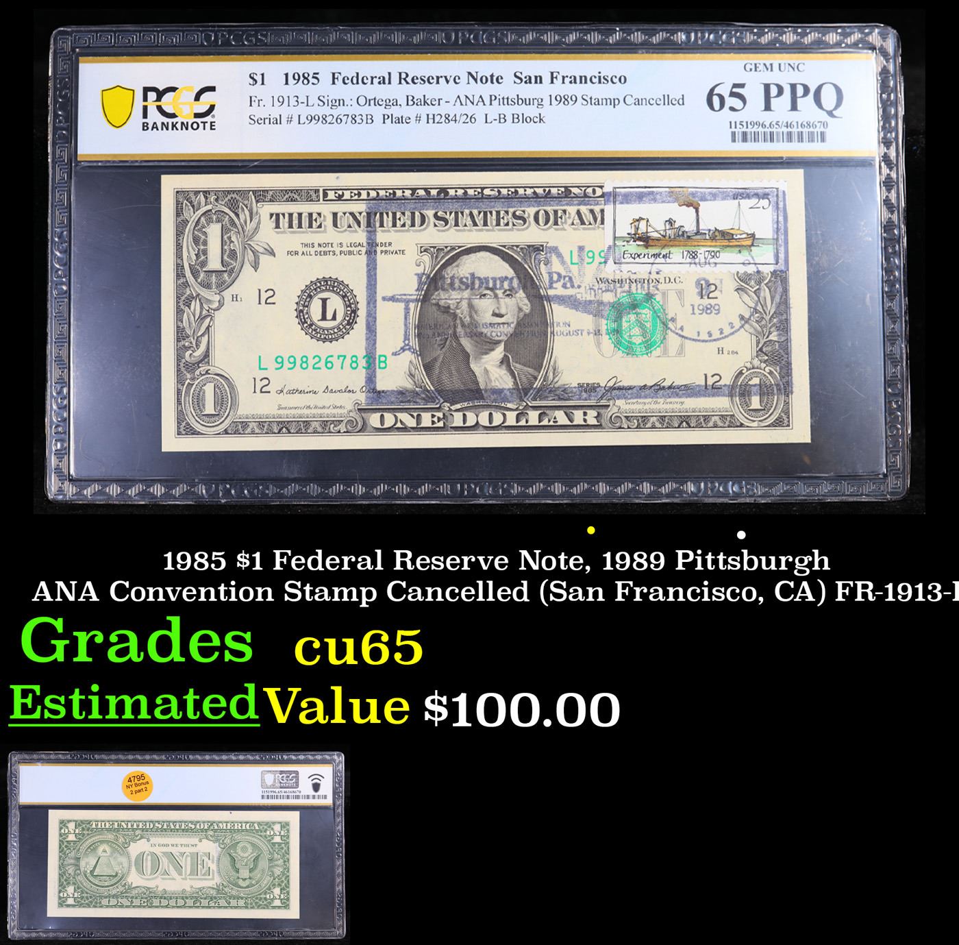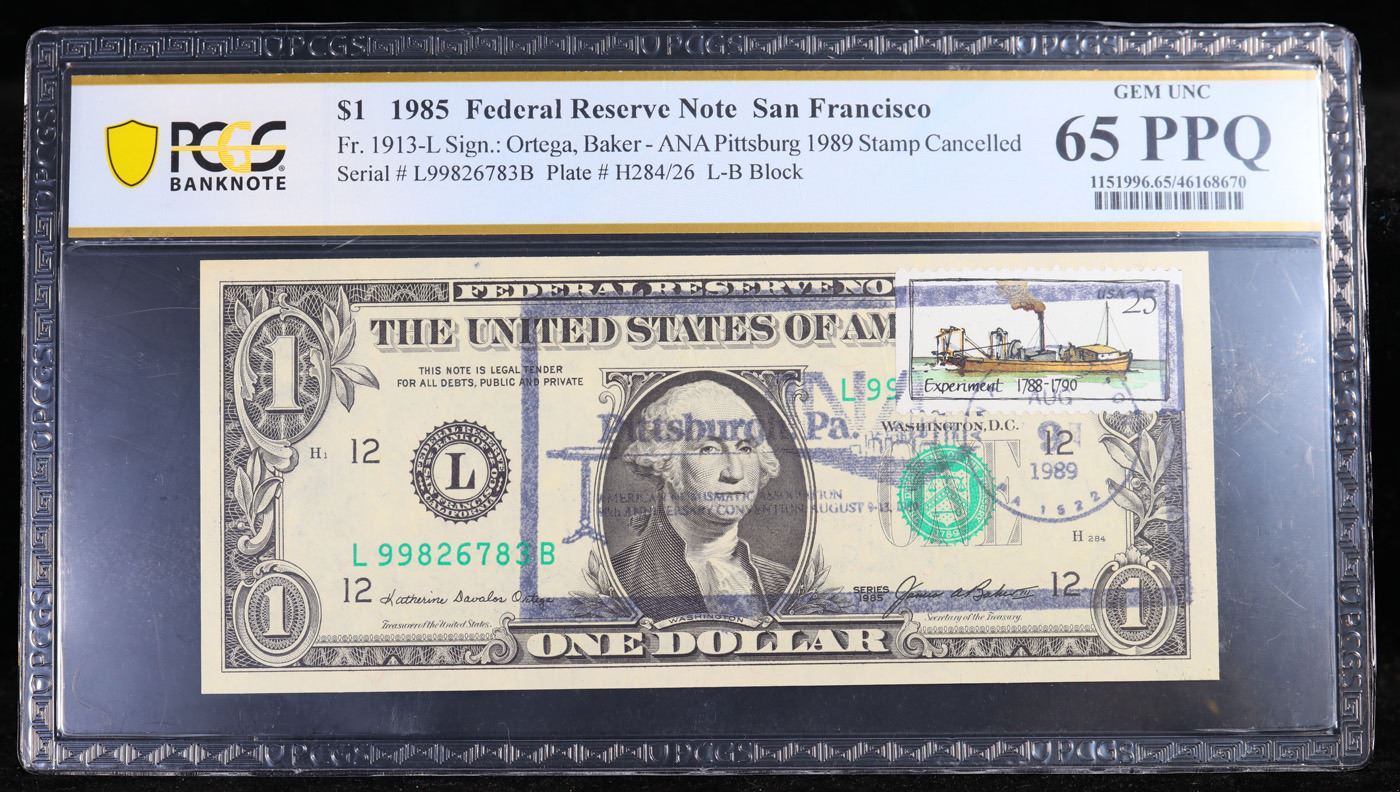 PCGS 1985 $1 Federal Reserve Note, 1989 Pittsburgh ANA Convention Stamp Cancelled (San Francisco, CA) FR-1913-L Graded cu65 By PCGS.