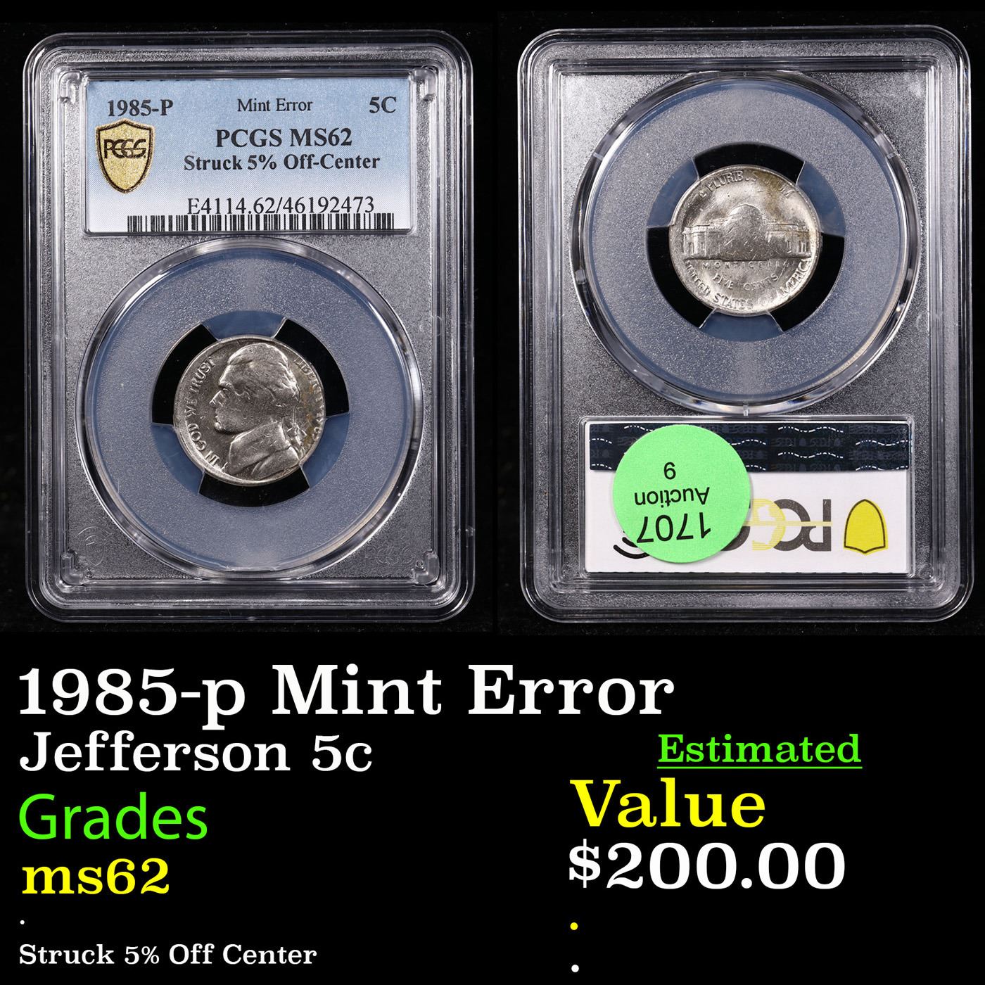 PCGS 1985-p Mint Error Jefferson Nickel 5c Graded ms62 By PCGS.