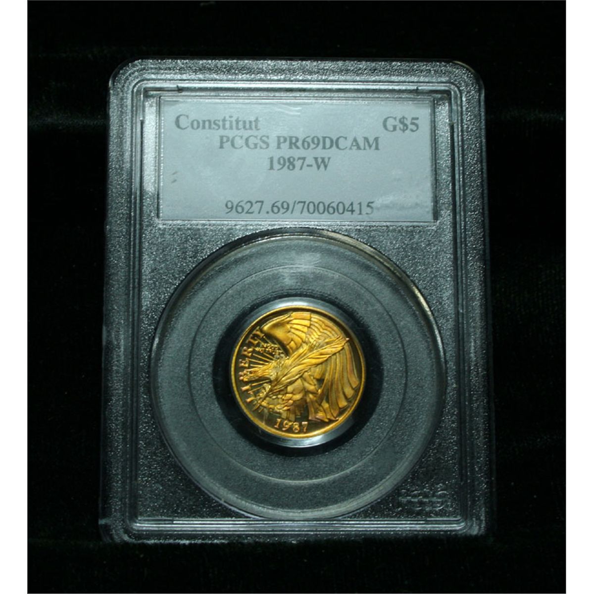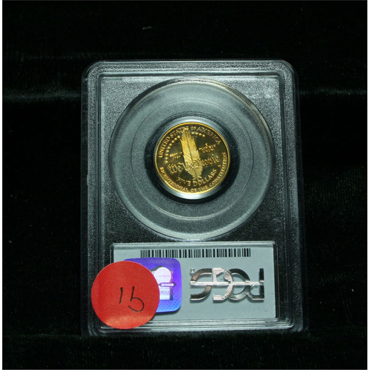 Great contrast and Frosty Devices highlight this gold Commemorative. Graded by PCGS, America's Top grading company. PCGS is the Strictest and harshest grader around. At any other grading service this would have been a PR70 DCAM and not a PR69 DCAM. In 1987 the U.S. Mint created a special commemorative Silver Dollar and a $5 gold pieces to honor the 200th Anniversary of the United States Constitution. The obverse of the $5 Gold features a side profile of an eagle with its wings raised, holding a quill pen; the reverse shows a vertical quill pen behind the words "We the People" in calligraphic style. The coin contains a Quarter Ounce of Gold (.242 to be precise). Estimated Value $650