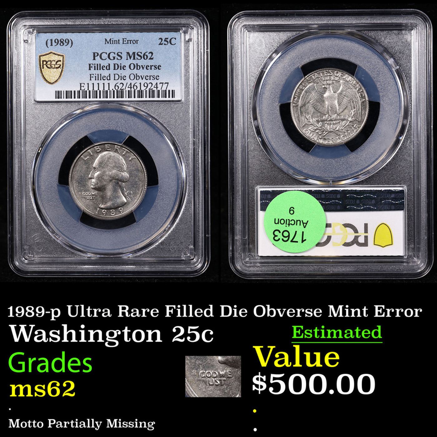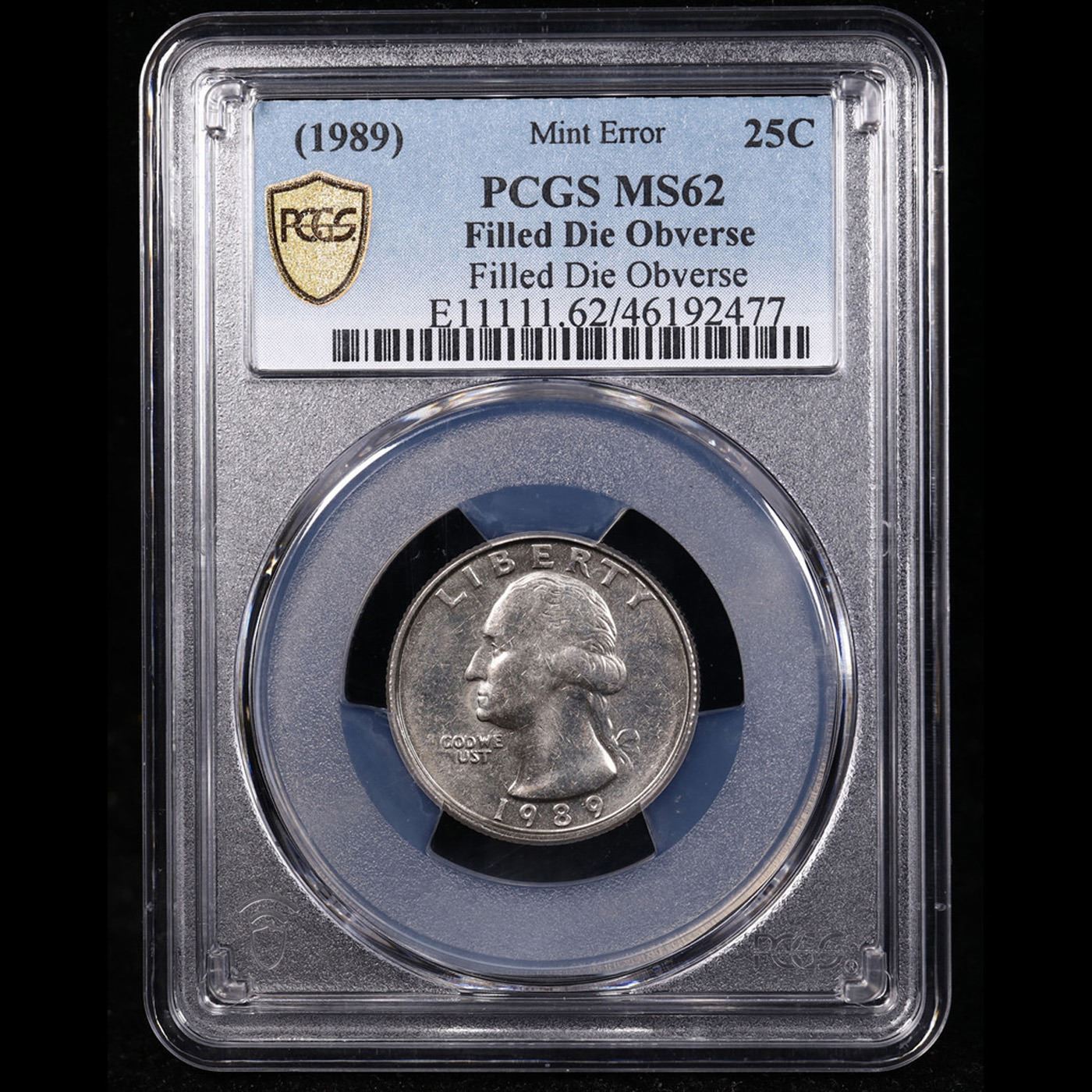 PCGS 1989-p Ultra Rare Filled Die Obverse Mint Error Washington Quarter 25c Graded ms62 By PCGS. A Key Date's Pick, Bid to Win Coin