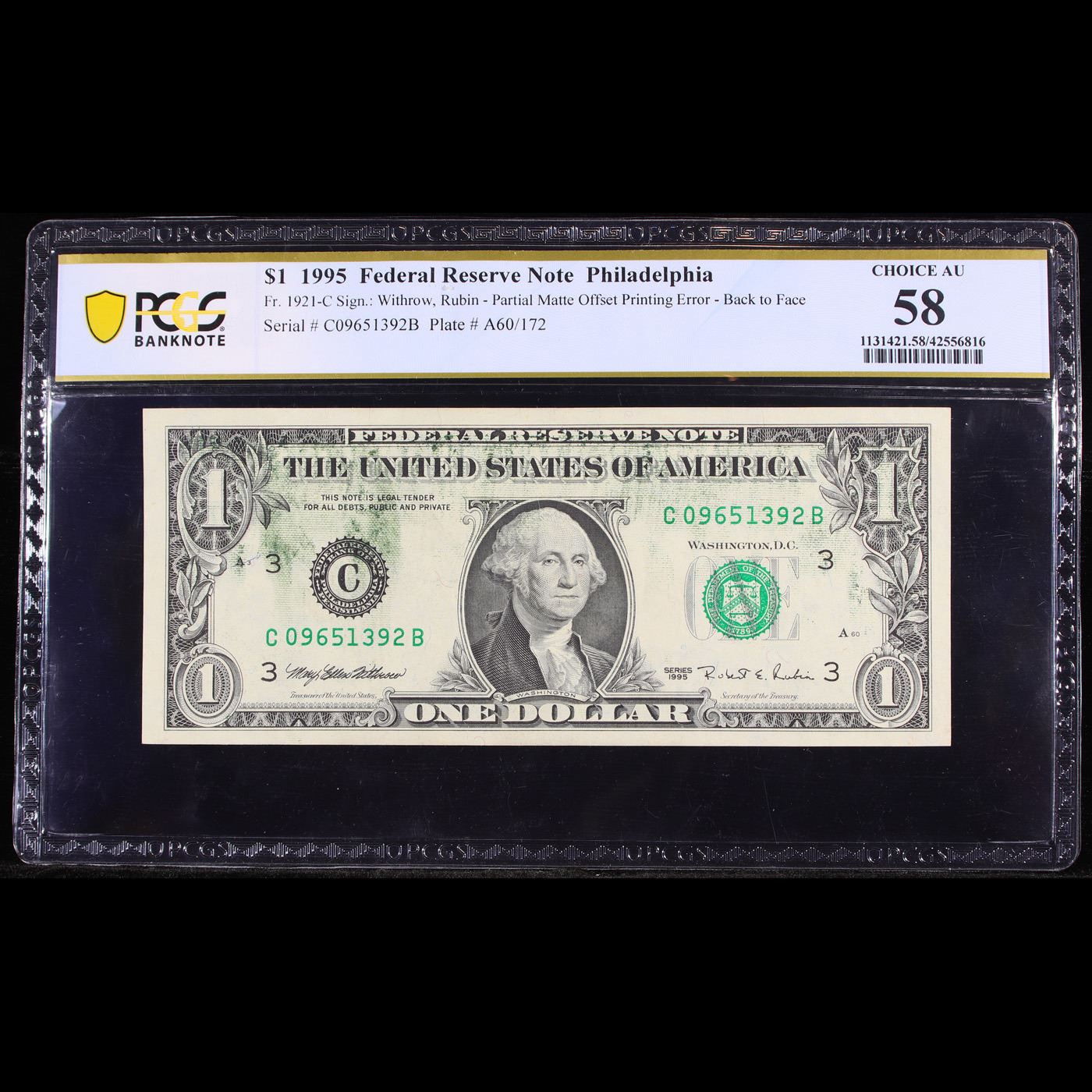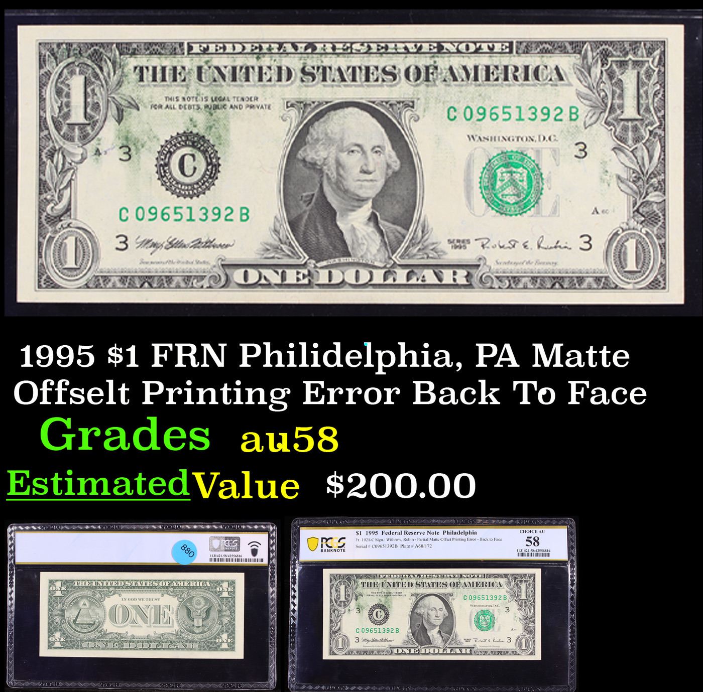 PCGS 1995 $1 FRN Philidelphia, PA Matte Offselt Printing Error Back To Face Graded au58 By PCGS.