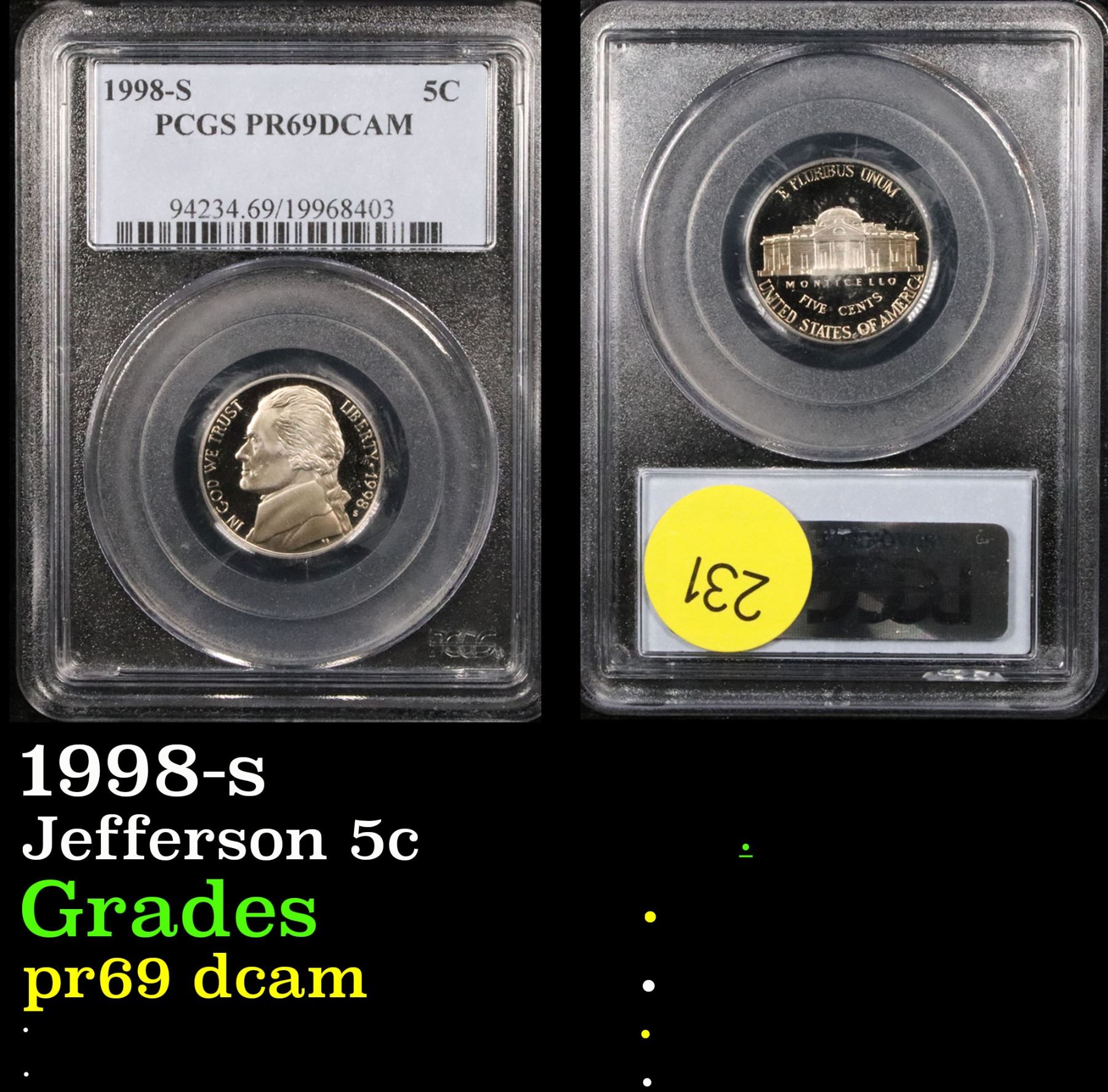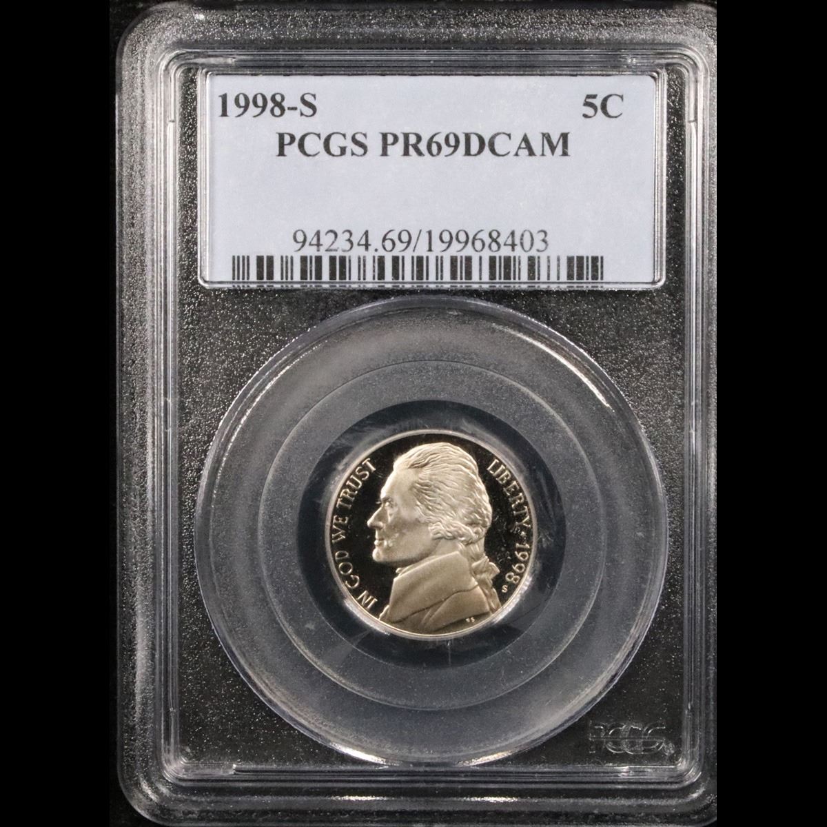PCGS 1998-s . . Jefferson Nickel 5c Graded pr69 dcam By PCGS.