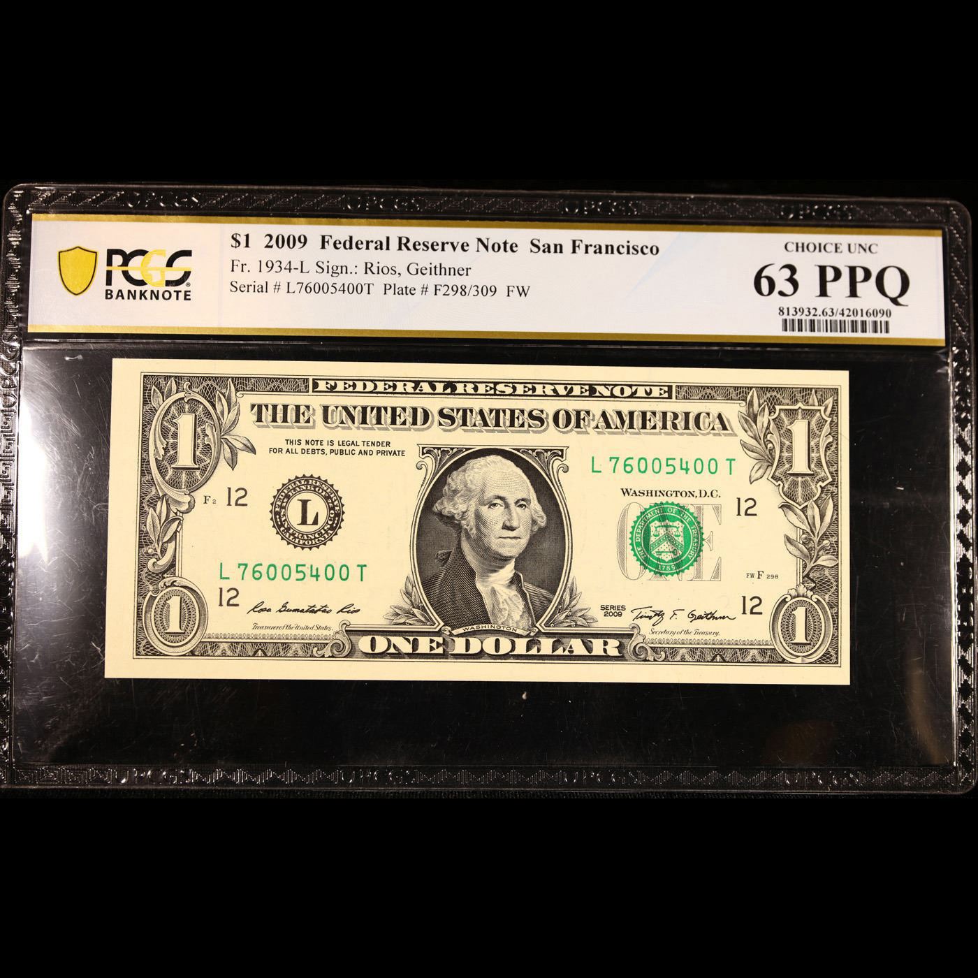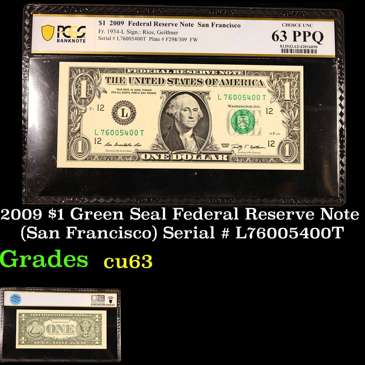 PCGS 2009 $1 Green Seal Federal Reserve Note (San Francisco) Serial # L76005400T Graded cu63 By PCGS.