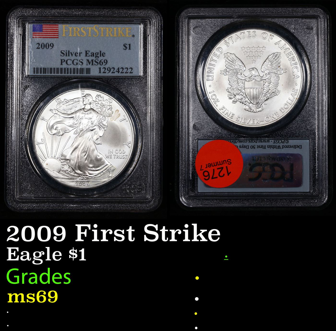 PCGS 2009 First Strike Silver Eagle Dollar $1 Graded ms69 By PCGS. This coin qualify as "First Strike" by PCGS because it was made in the first 30 days of the Mint's Release.