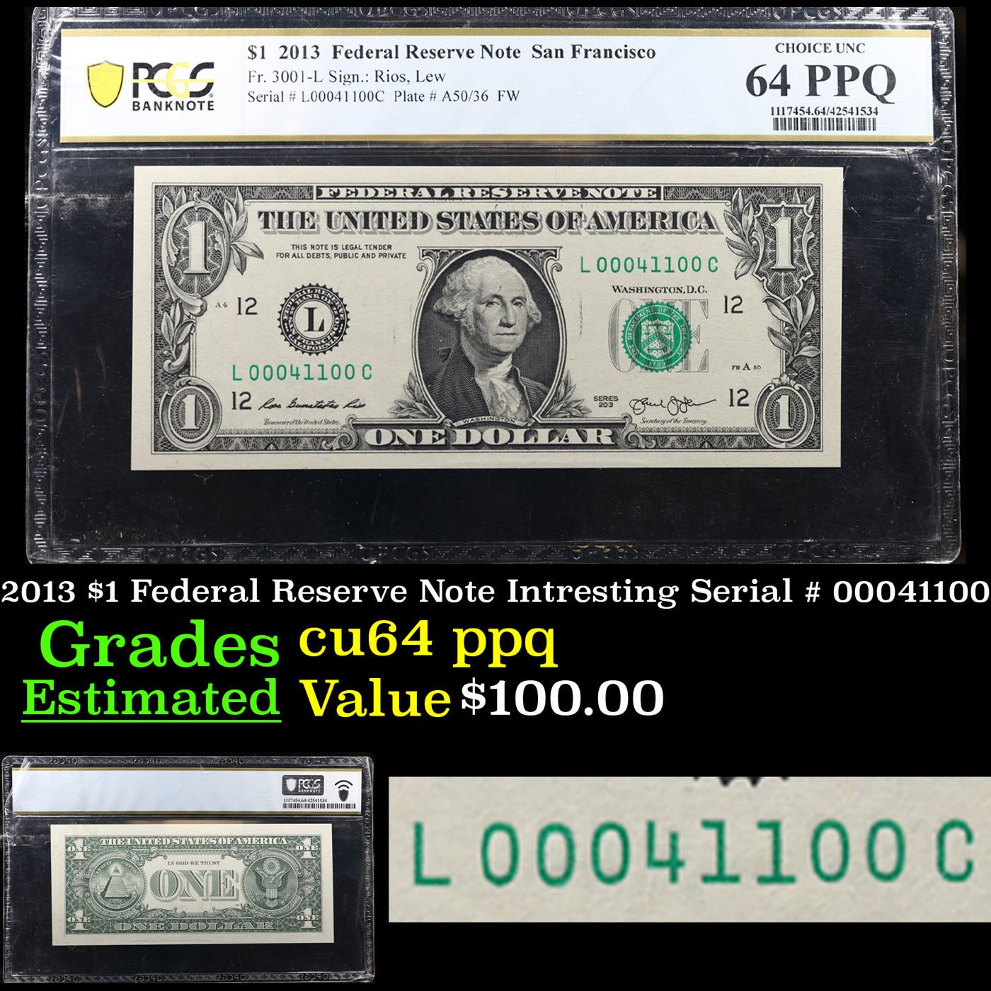 PCGS 2013 $1 Federal Reserve Note Intresting Serial # 00041100 Graded cu64 ppq By PCGS.
