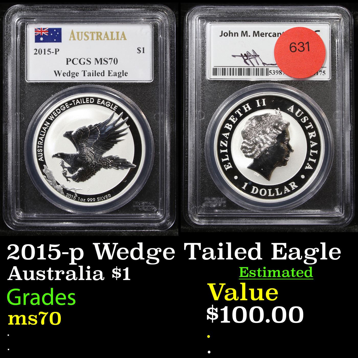PCGS 2015-p Wedge Tailed Eagle Australia $1 Graded ms70 By PCGS. A Majestic Eagle Takes Flight!The U.S. Mint has been striking Silver Eagles ever since 1986. the eagle on the coins was designed by John Mercanti, the 12th Chief Engraver of the U.S. Mint. This is the first time in coinage history that a U.S. Mint Chief Engraver has designed a coin for another world mint! It's the 2014 Australia Wedge Tailed Eagle Silver Dollar.