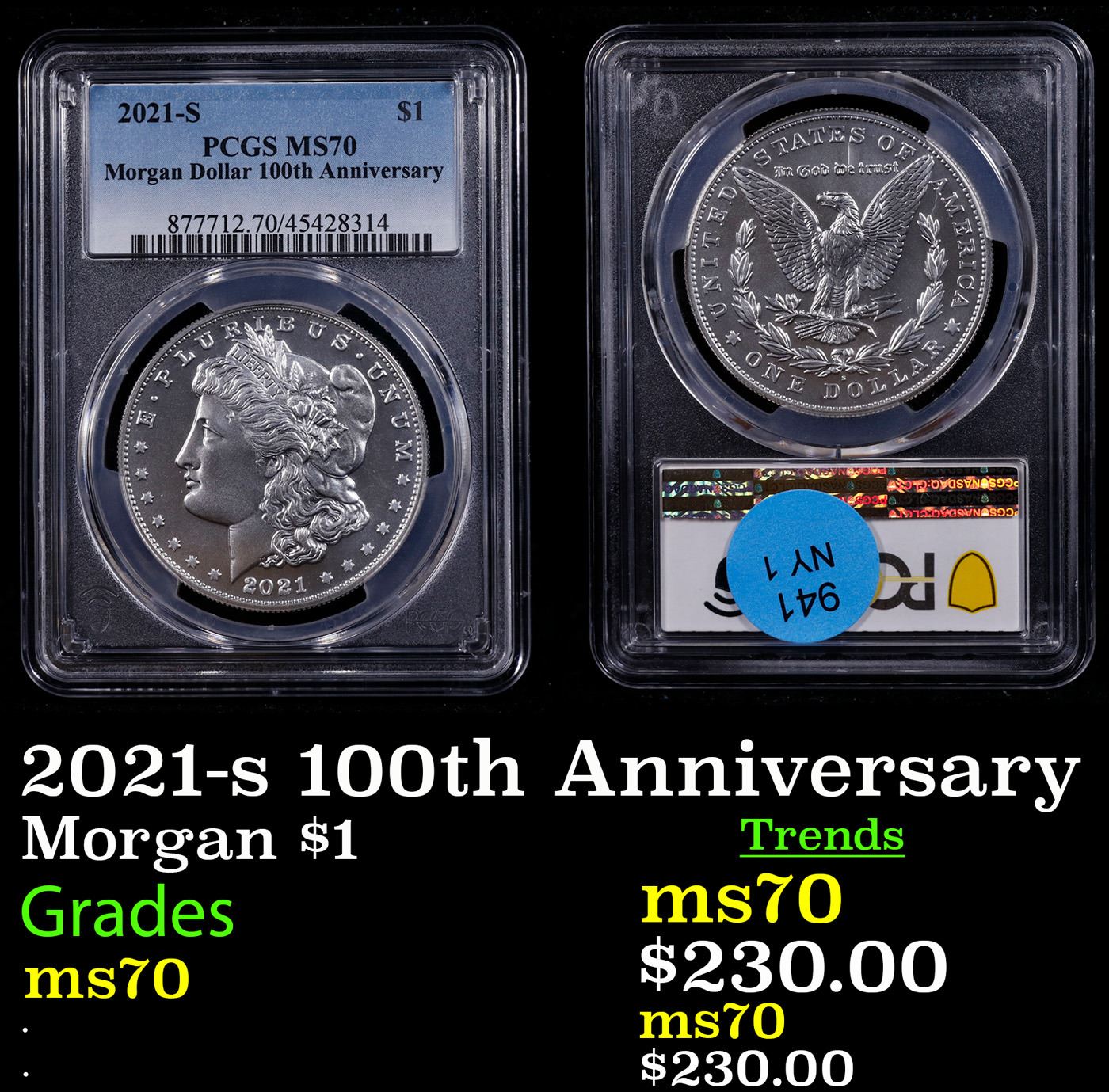 PCGS 2021-s 100th Anniversary Morgan Dollar $1 Graded ms70 By PCGS. A Corey's Pick, Bid to Win Coin
