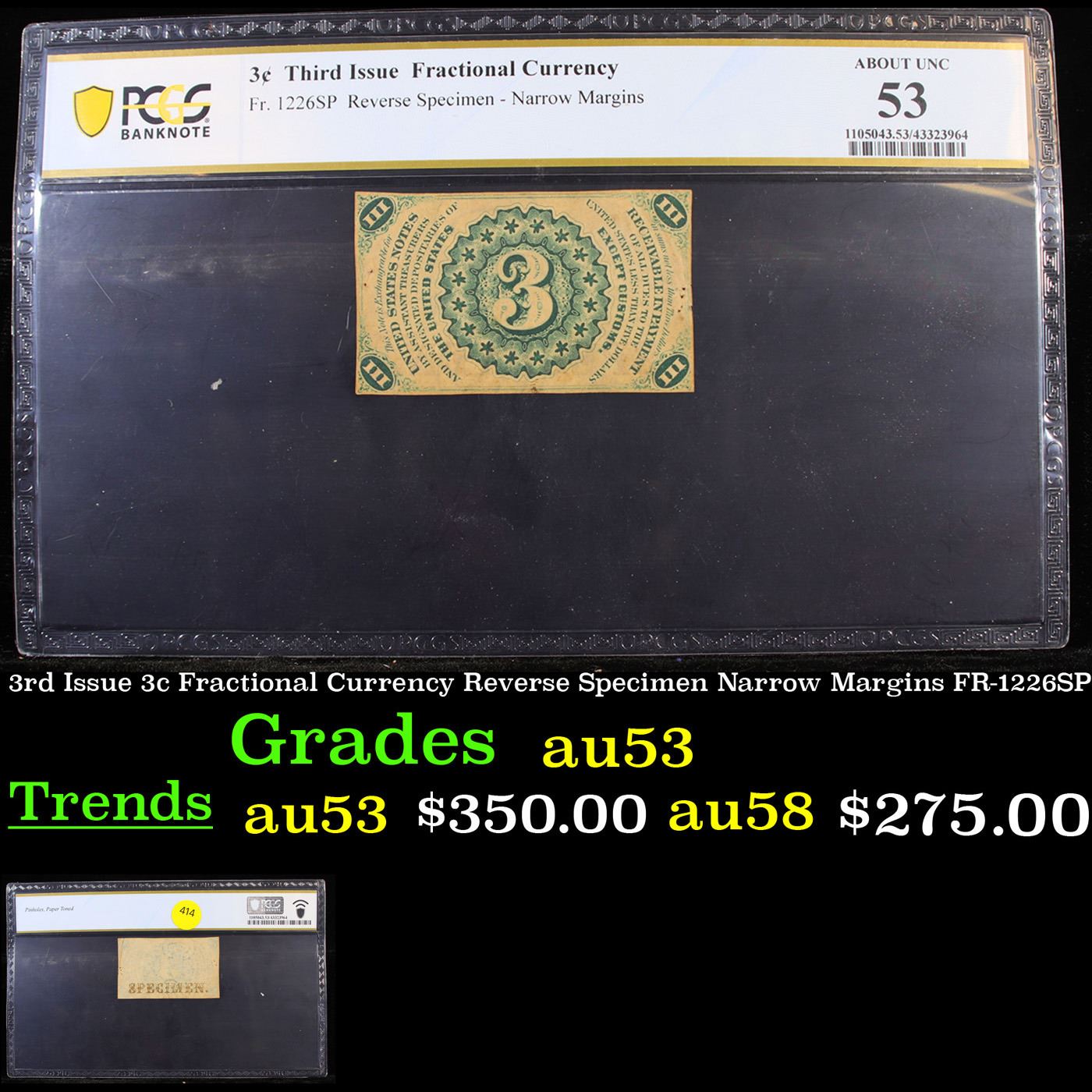 PCGS 3rd Issue 3c Fractional Currency Reverse Specimen Narrow Margins FR-1226SP Graded au53 By PCGS