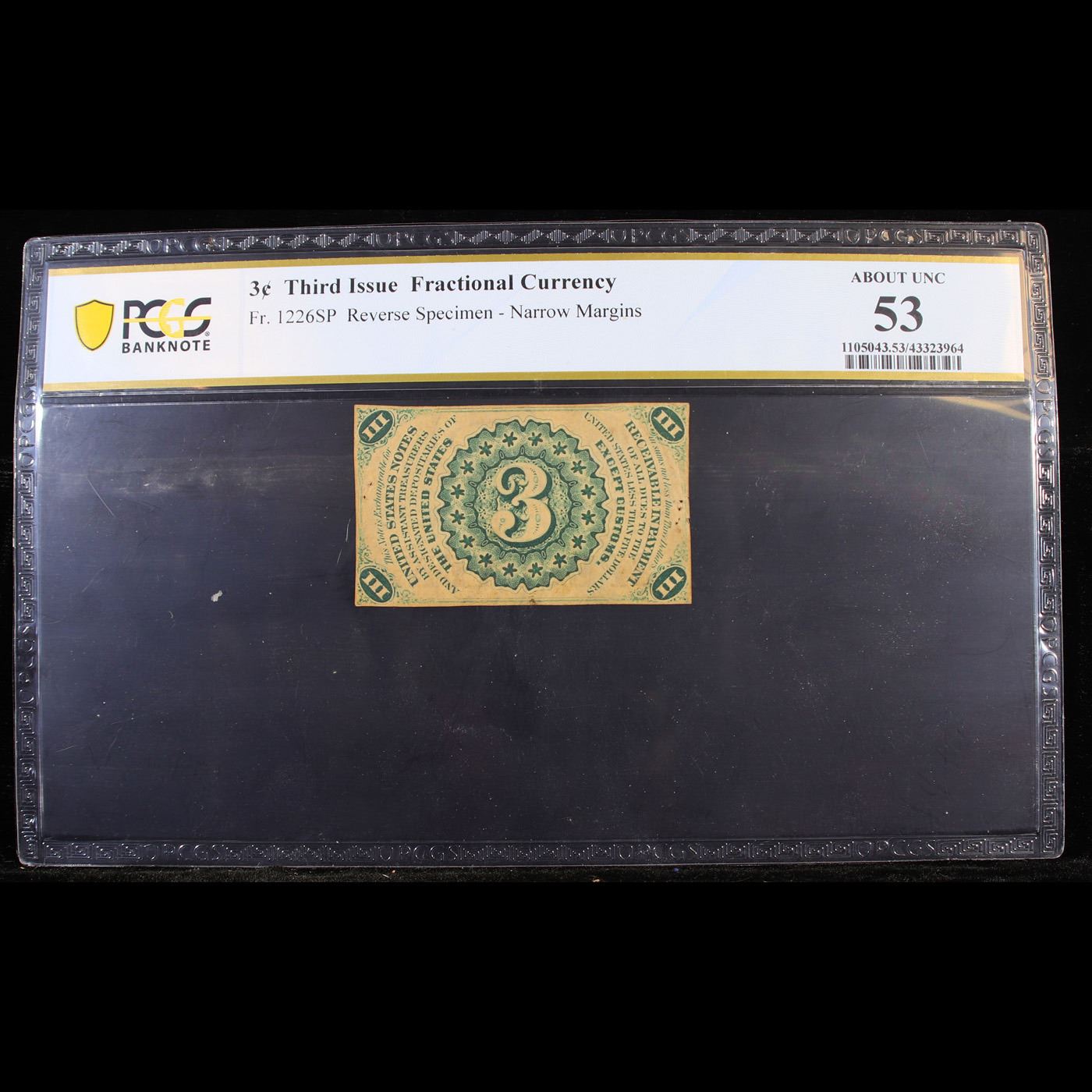 PCGS 3rd Issue 3c Fractional Currency Reverse Specimen Narrow Margins FR-1226SP Graded au53 By PCGS. Fractional or postage currency has a rich history. At the beginning of the Civil War people starting hoarding coins for their precious metal content. Coins became difficult to find because of the hoarding. People started to try to use stamps instead of coins as a means of commerce. The government decided to help ease the hoarding issue by issuing “paper coins” also known as postage currency or fractional currency. Fractional currency was first issued on August 21, 1862 and they were last issued on February 15, 1876. Three cents, five cents, ten cents, twenty-five cents, and fifty cents notes were all issued. Fractional currency is physically smaller than other United States money. It also does not have a serial number.