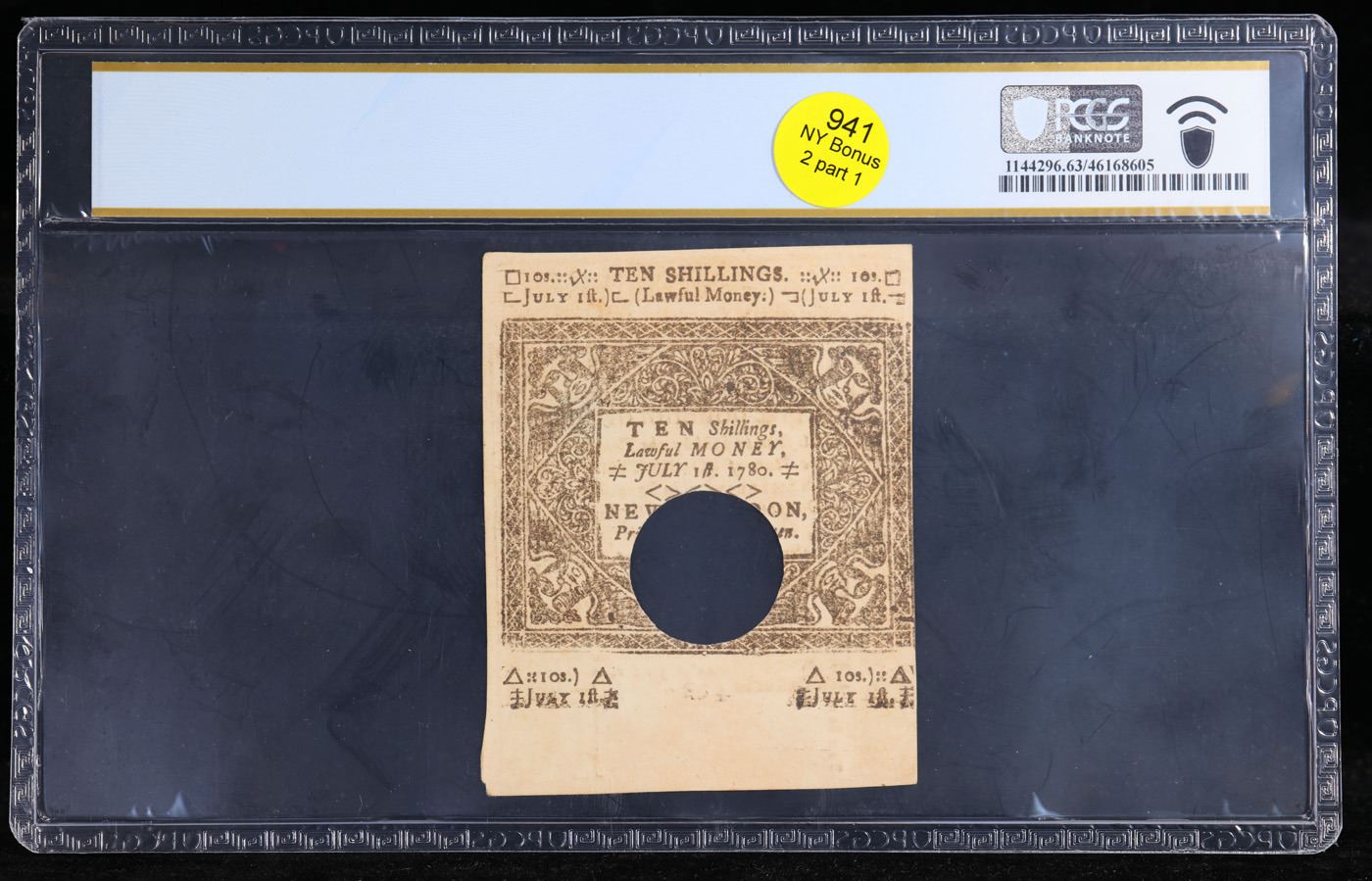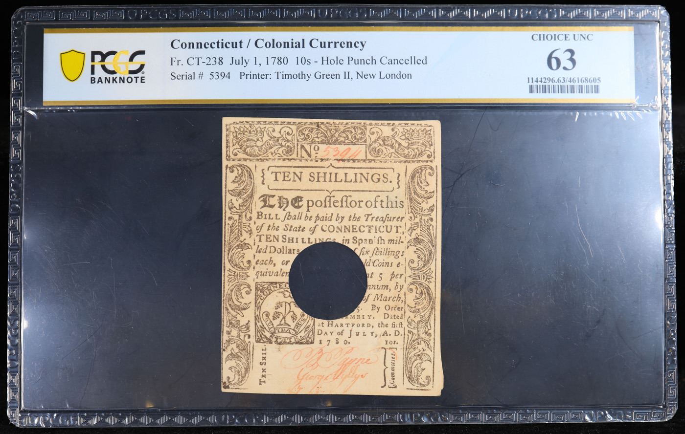 PCGS Connecticut July 1, 1780 Ten Shilling (10s) Colonial Currency, Printed By Timothy Green II, Punch Cancelled FR-CT-238 Graded cu63 By PCGS. This note is from the July 1, 1980 issue of Connecticut colonial currency, which was the final issue. A Corey's Pick
