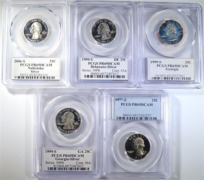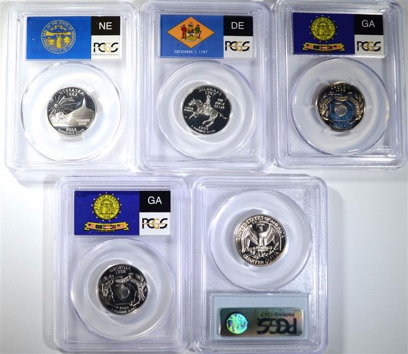 1977-S, 1999-S GEORGIA SILVER, 1999-S GEORGIA, 1999-S DLEAWARE SILVER, & 2006-S NEBRASKA SILVER ESTIMATE $120 - $140.