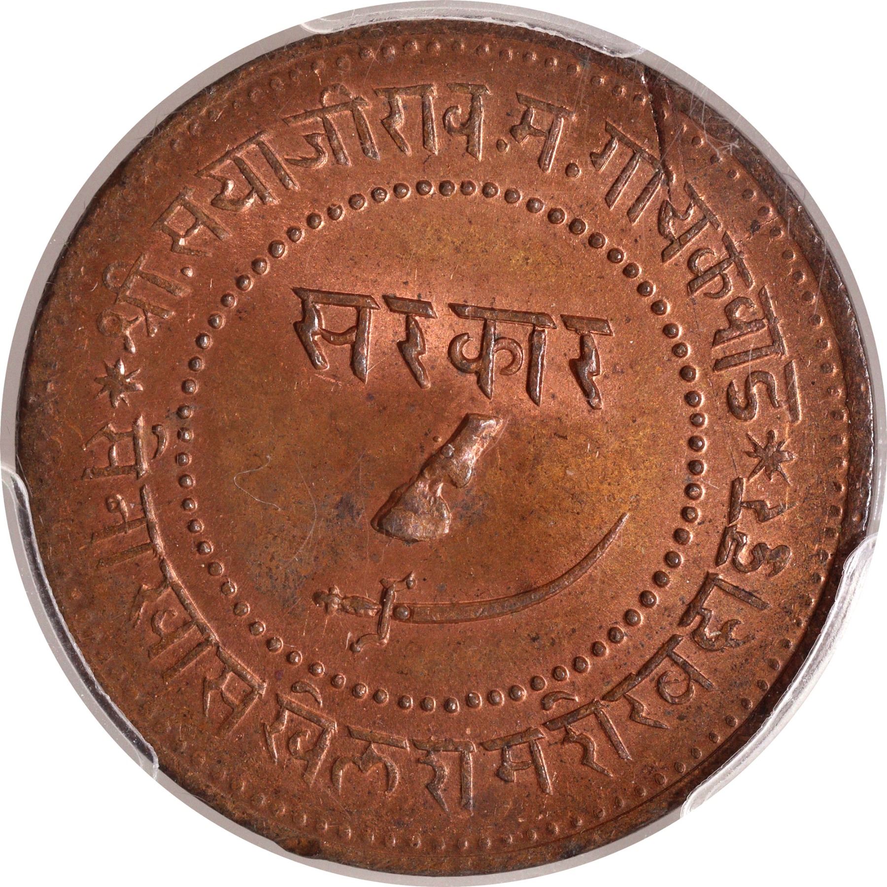 outside circle, "Shri Sayajirao. M .Gaekwad" & "Sena Khas Khel Shamsher Bahadur", short hoof, scimitar, all within beaded circle, Rev: value and VS date in Devnagari legend within beaded circle, "Samvat dhon paise", graded & slabed by PCGS as MS64RB, Very Scarce.