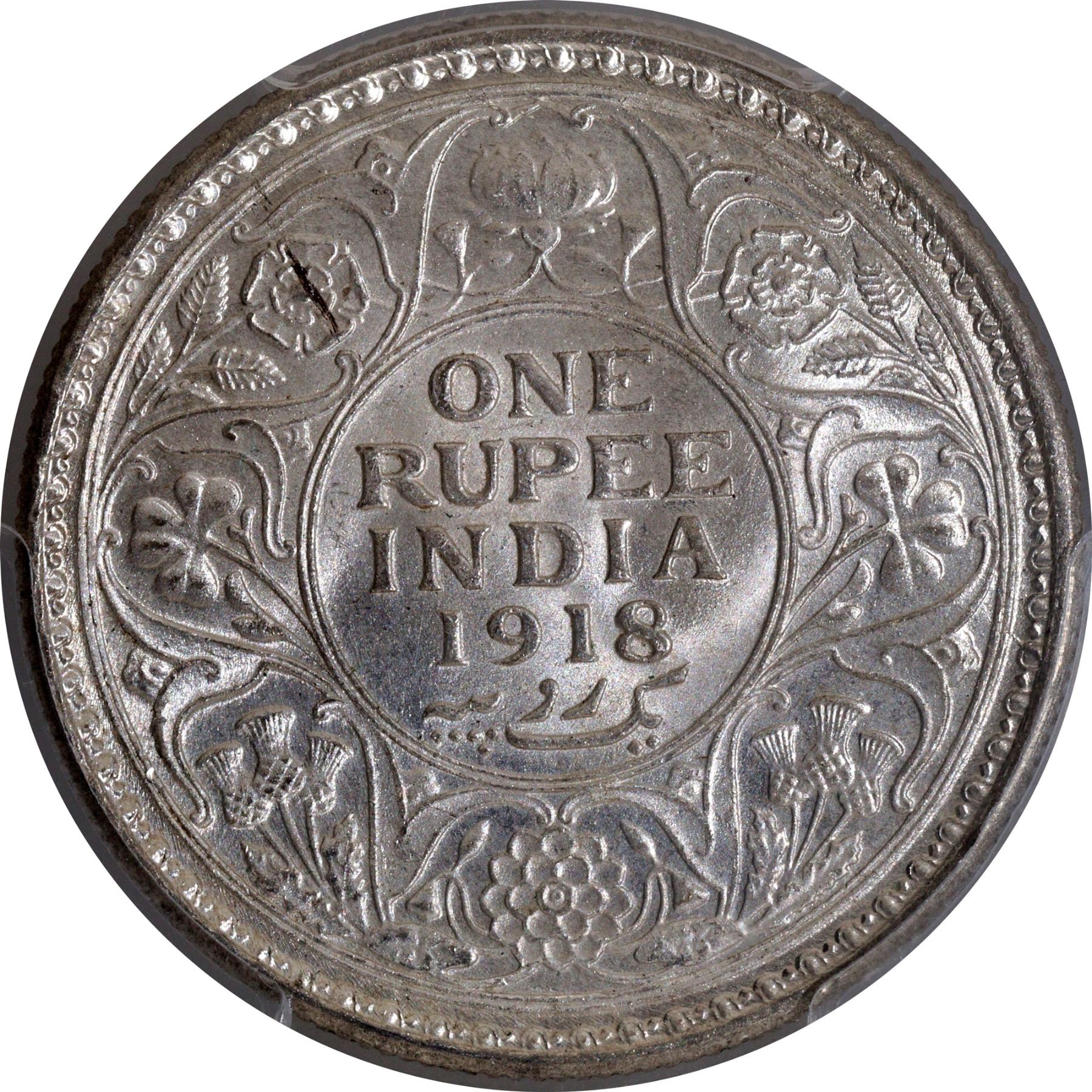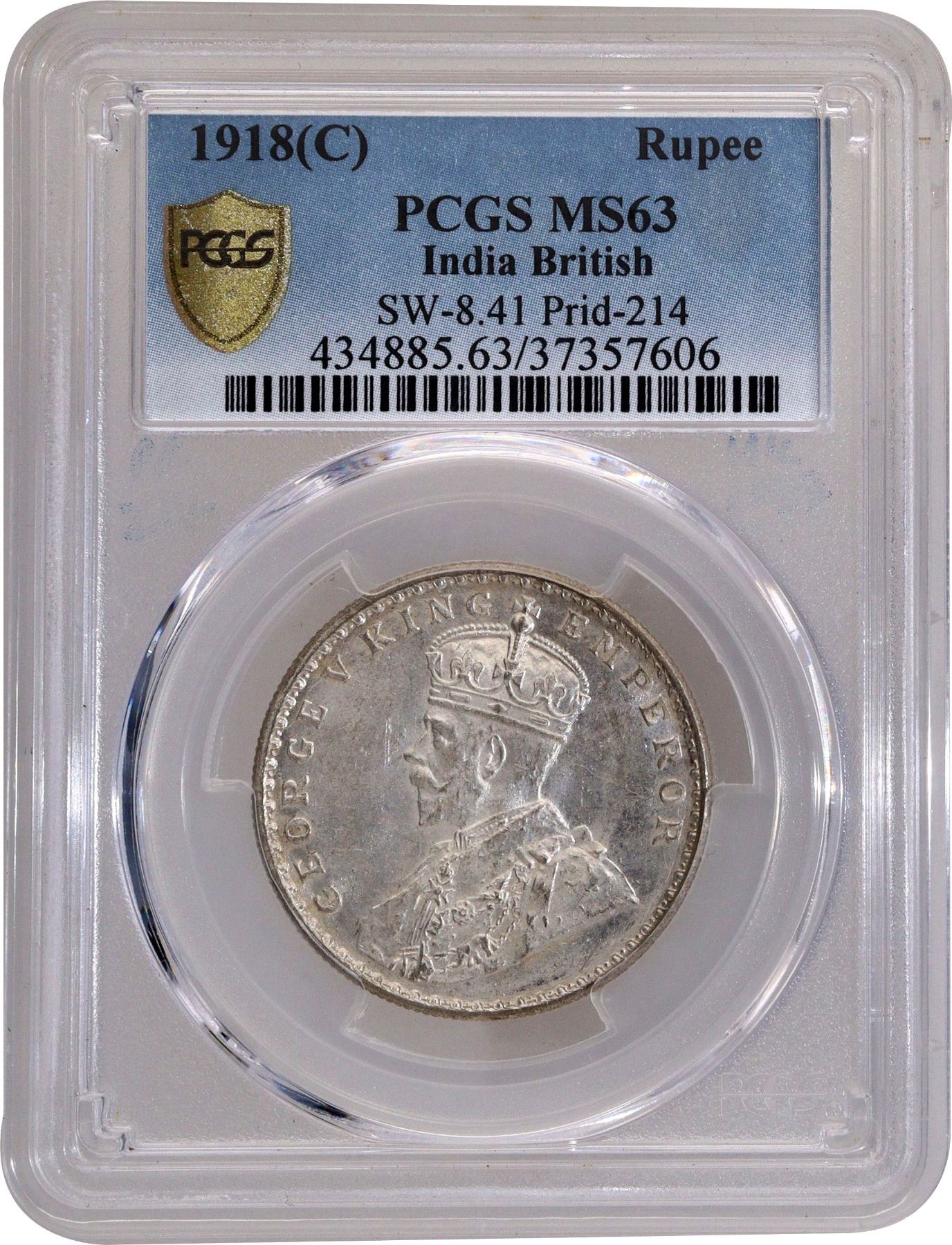 1918, King George V, Silver Rupee, Calcutta Mint, no dot, (PR # 214/GK # 1037), graded & slabbed by PCGS as MS 63.