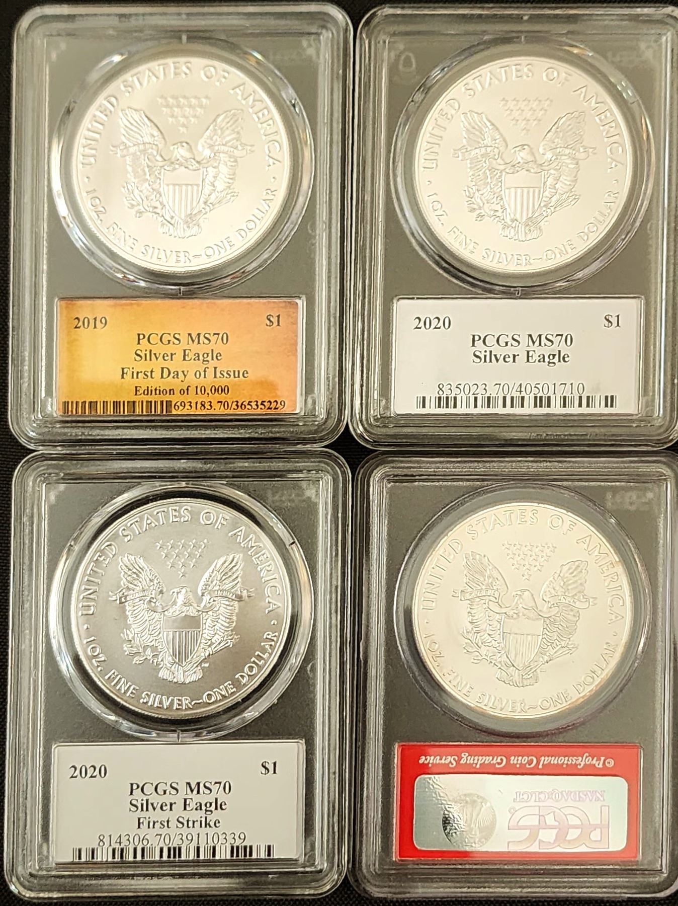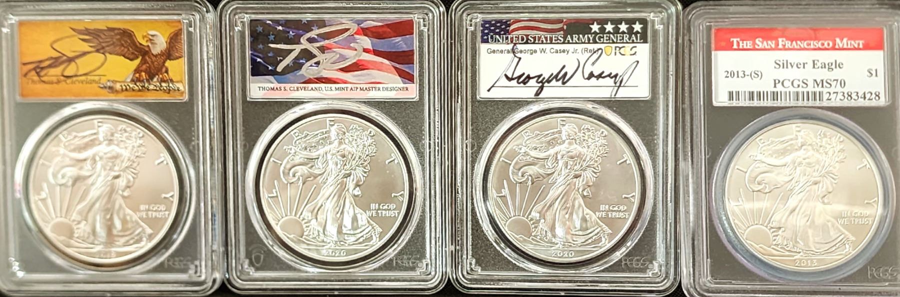 4 - PCGS MS70 Silver Eagles, includes - 2019 Thomas S. Cleveland Signed First Day Issue Edition of 10,000, 2020 Thomas S. Cleveland Signed US Mint AIP Master Designer, 2020 General George W. Casey Jr. (Ret.) First Strike, 2013 (S).
