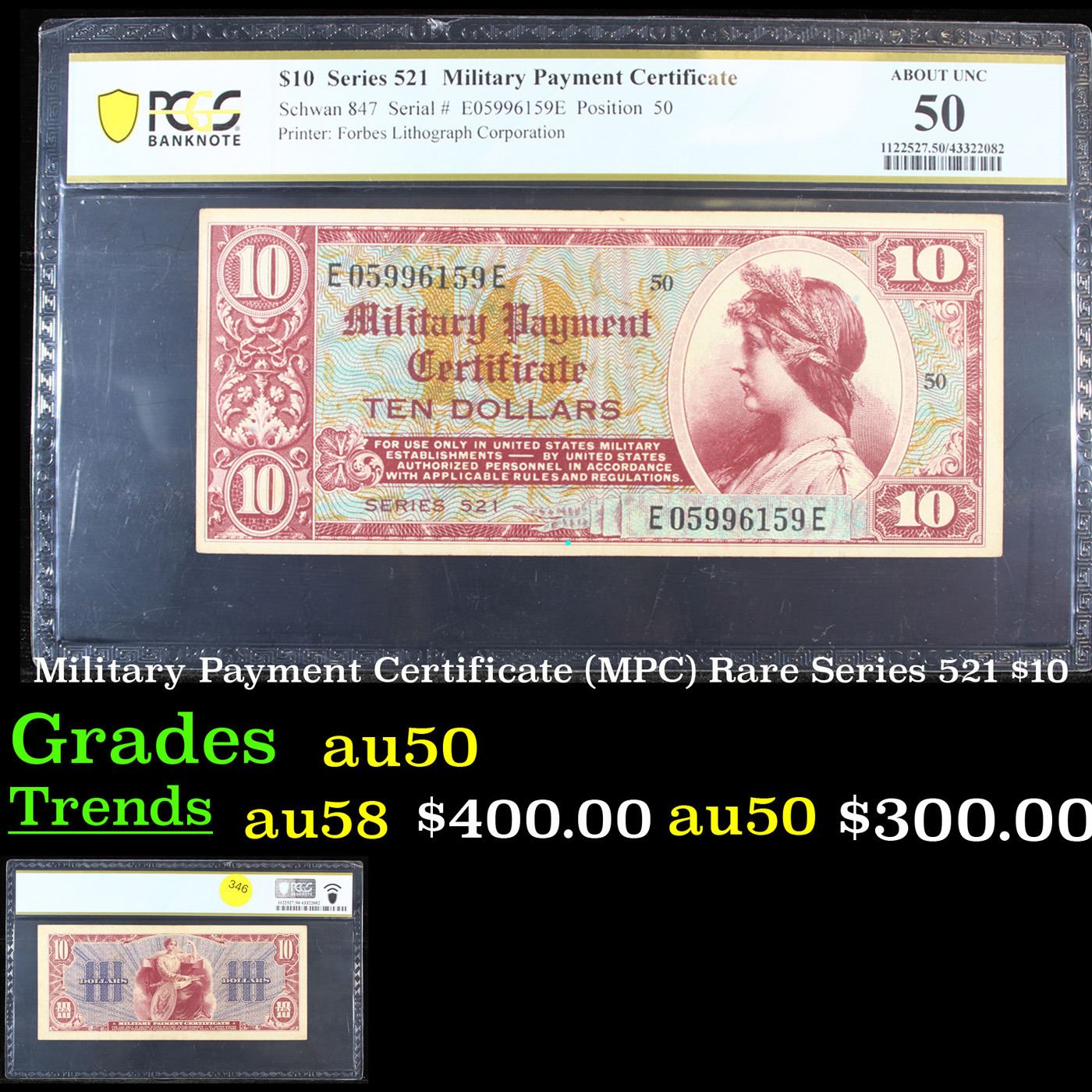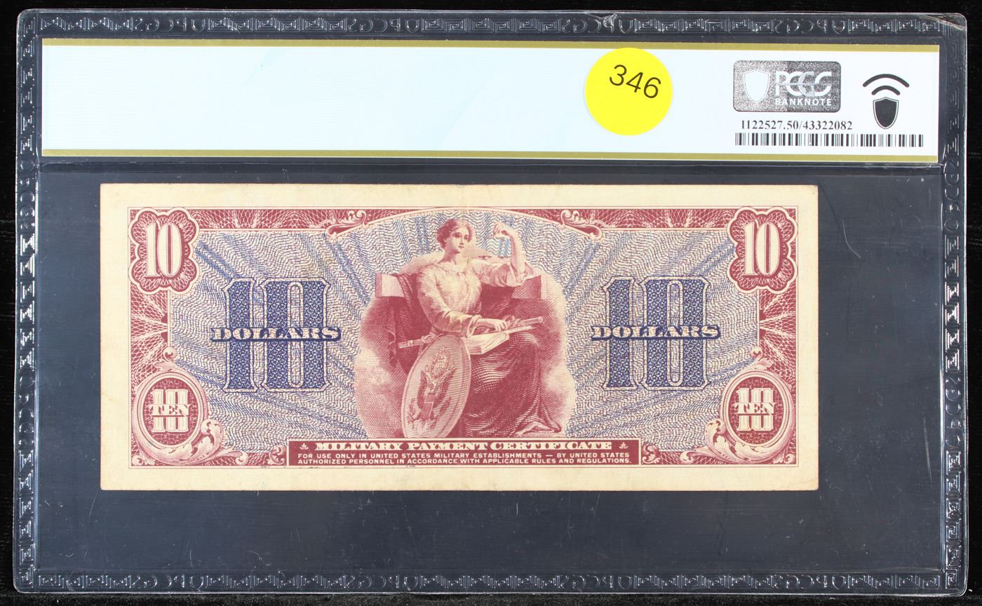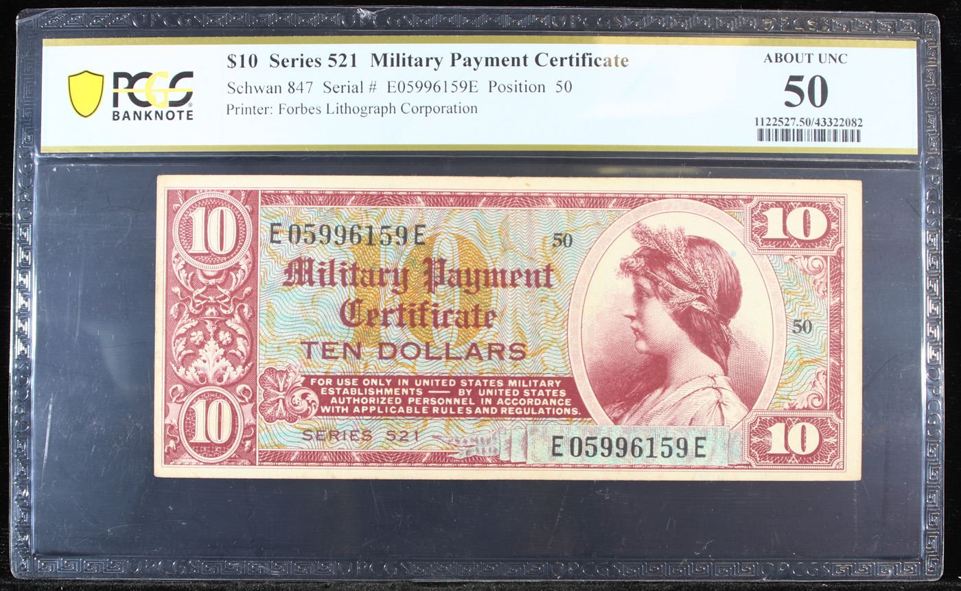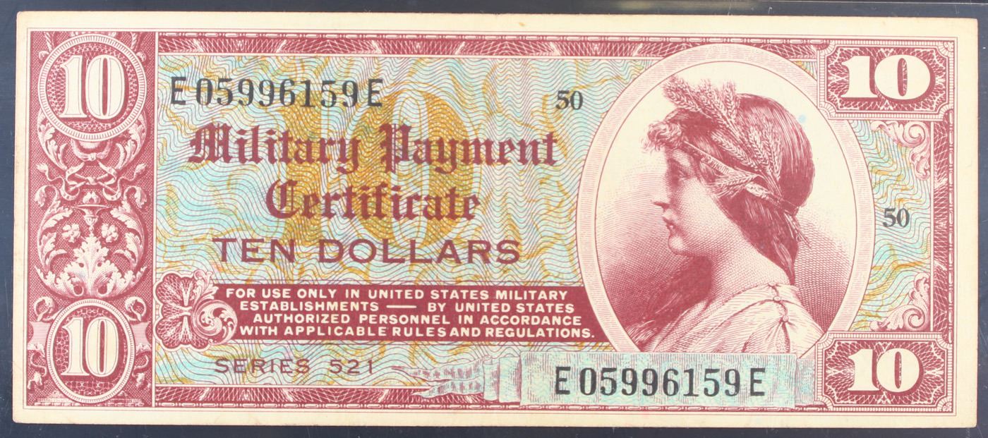 PCGS Military Payment Certificate (MPC) Rare Series 521 $10 Graded au50 By PCGS. Military payment certificates (MPC) were used to pay US military personnel stationed in foreign countries. They were created in order to reduce currency arbitrage. These MPCs could be redeemed for US dollars when a soldier left an MPC zone. If a soldier went on leave then the MPCs could be converted into local currency.