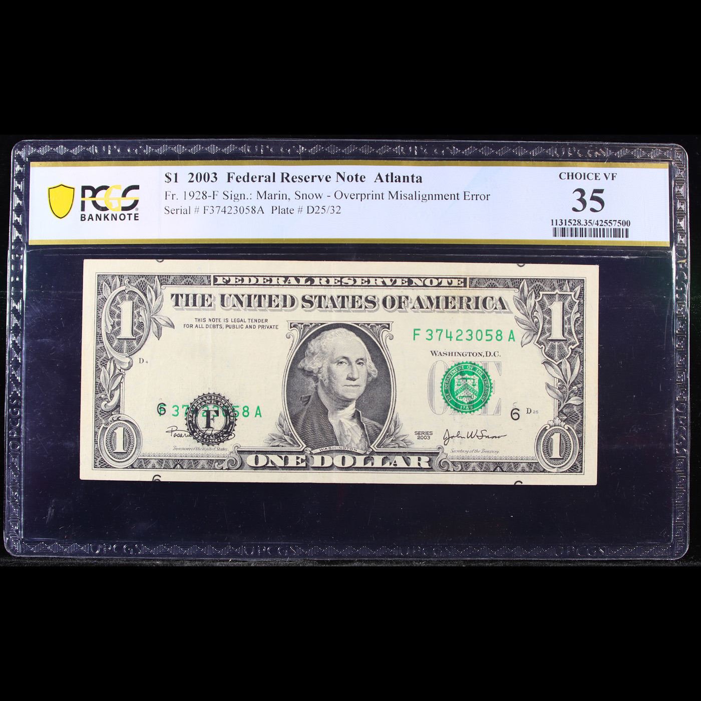 PCGS Mint Error Overprint Misalignment Error Cool! 2003 $1 FRN Atlanta, GA Graded vf35 By PCGS.