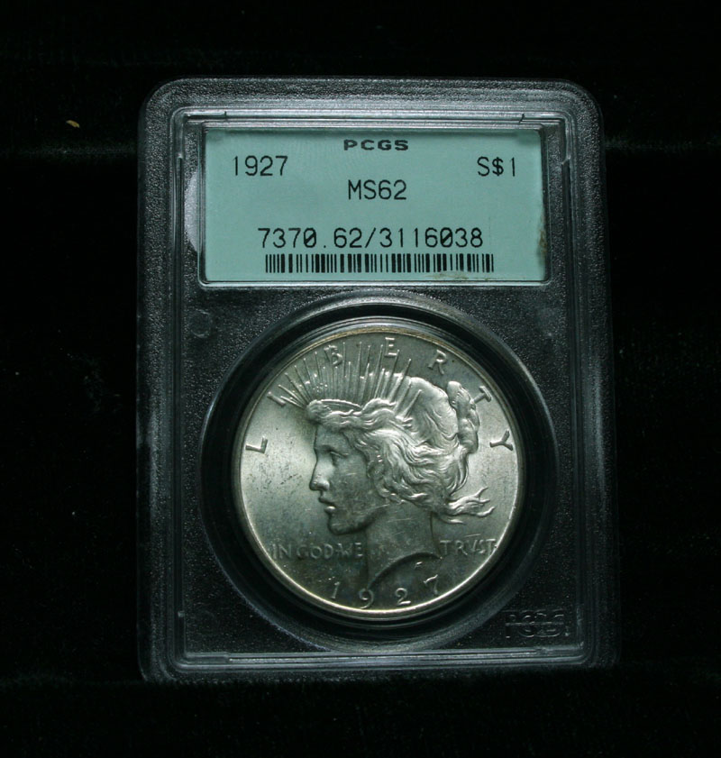 Attractive example that is near mark free and looks like a good upgrade opportunity. The 1927-p is the 2nd lowest mintage for the entire Peace Dollar Series. Lower mintage than the 1921-p, 1934-s and every other issue but for the 1928-p. Graded by America's #1 and harshest grading company PCGS. PCGS in their first years graded harsher than they do today. Premium is generally added to the Original Green Holders, referred to as OGH, as a grade upgrade is often possible. The Wholesale Greysheet lists ms63 at $150. Estimated Value $125