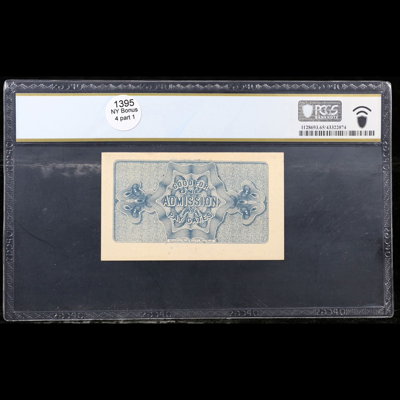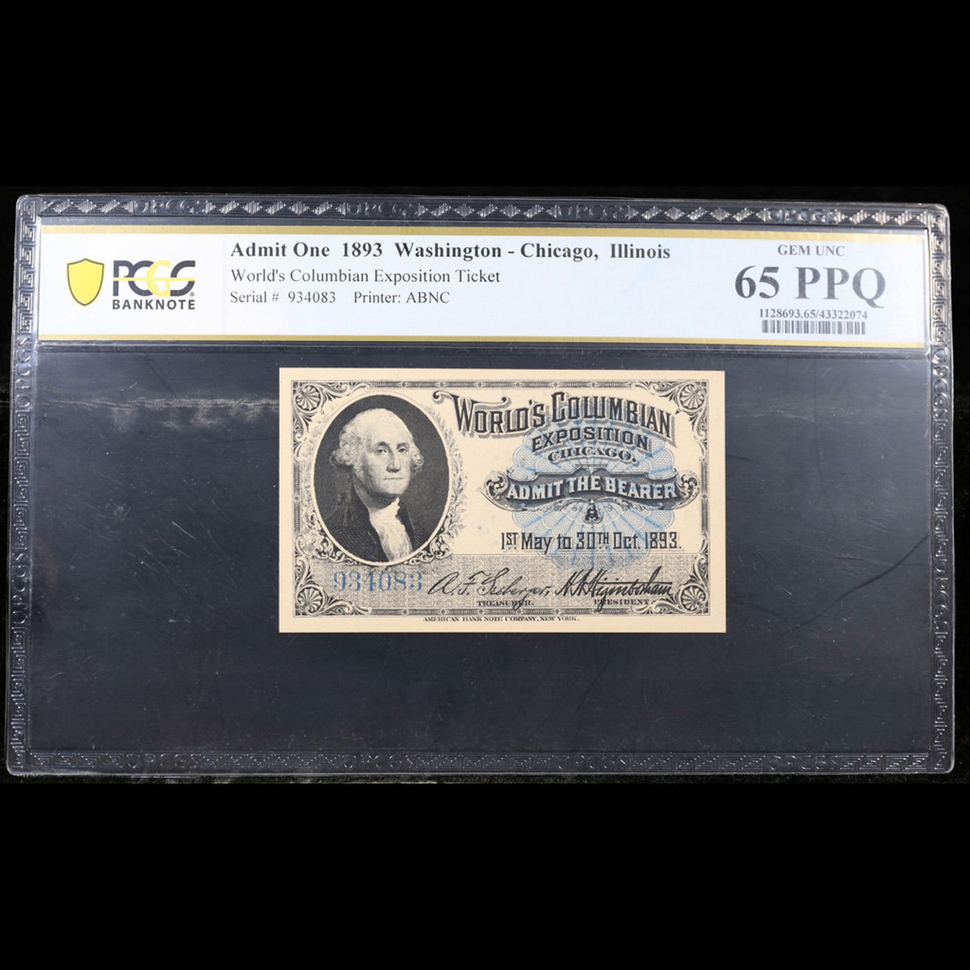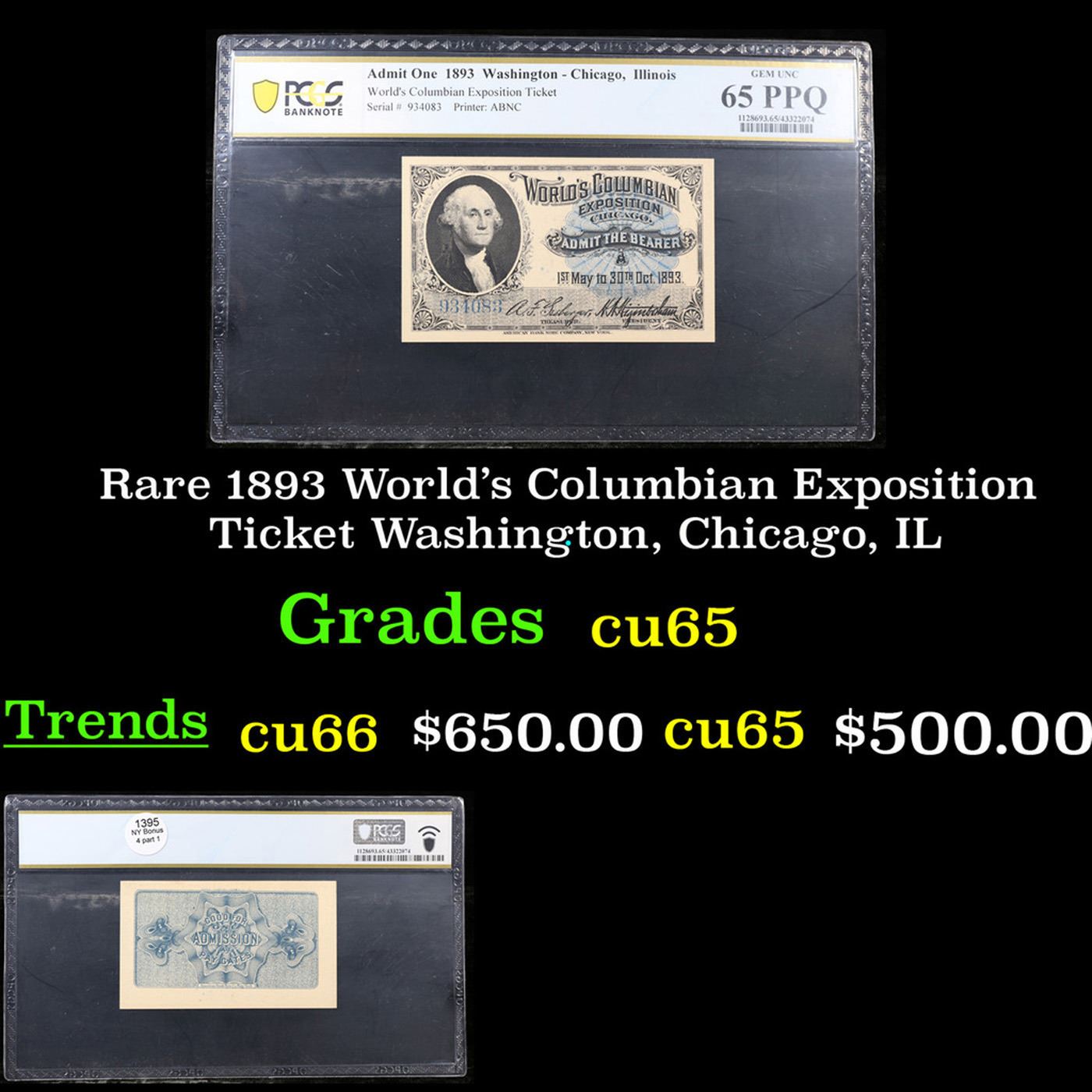 PCGS Rare 1893 World's Columbian Exposition Ticket Washington, Chicago, IL Graded cu65 By PCGS. George Washington Columbian Exposition Admission ticket, admit the bearer from 1st May to 30th Oct 1893. These beautiful admission tickets to the Chicago World's Fair of 1893 were printed by the American Banknote Company. The have the appearance of fractional currency. They used some of the latest anti-counterfeiting technology at the time. Little colored tissue paper dots laminated between the layers of paper. There are 10 different varieties to a set of these tickets. A Corey's Pick, Bid to Win, Don't let it get Away, you might not find its equal Coin. I give this coin my highest recommendation