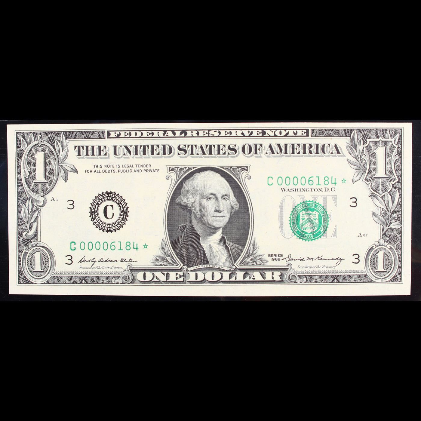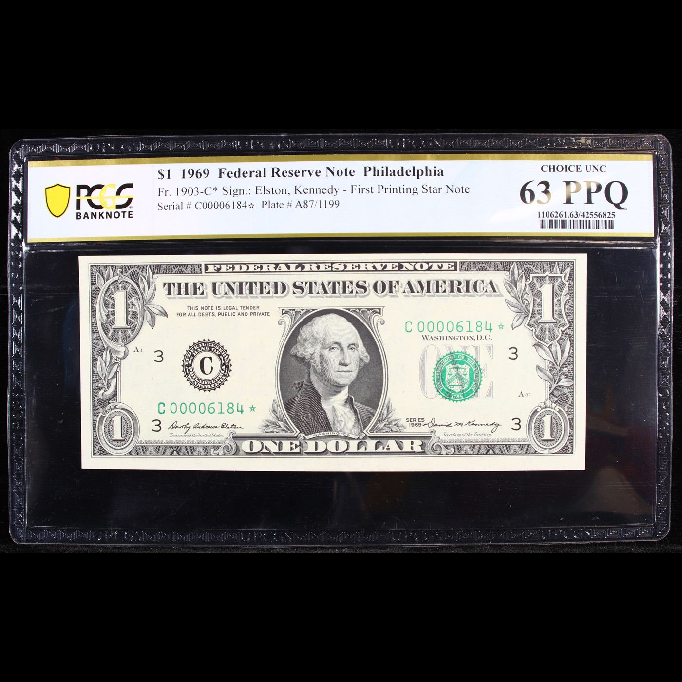 PCGS **Star Note** First Printing 1969 $1 FRN Philidelphia, PA Low Serial #00006184 Graded cu63 PPQ By PCGS.