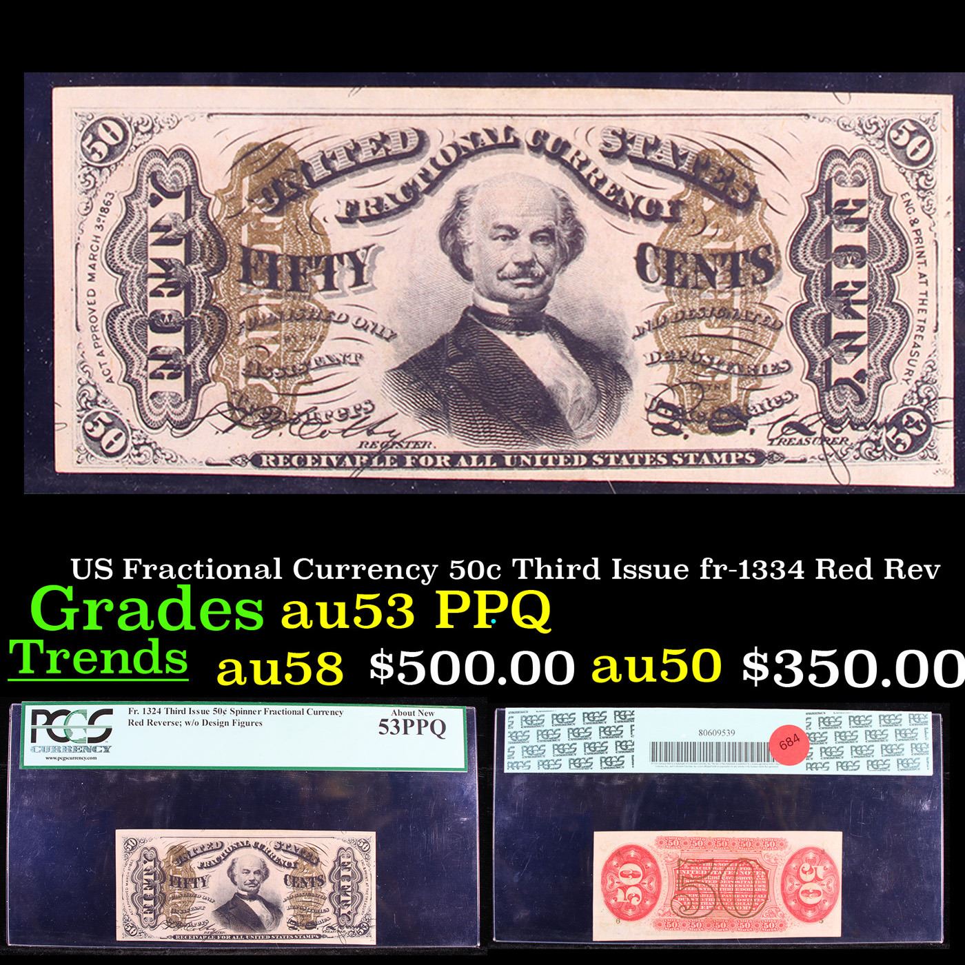 PCGS US Fractional Currency 50c Third Issue fr-1334 Red Rev Graded au53 PPQ By PCGS. Francis Elias Spinner was an American politician from New York. He served as Treasurer of the United States from 1861 to 1875, and was the first administrator in the federal government to employ women for clerical jobs. Fractional or postage currency has a rich history. At the beginning of the Civil War people starting hoarding coins for their precious metal content. Coins became difficult to find because of the hoarding. People started to try to use stamps instead of coins as a means of commerce. The government decided to help ease the hoarding issue by issuing “paper coins” also known as postage currency or fractional currency. Fractional currency was first issued on August 21, 1862 and they were last issued on February 15, 1876. Three cents, five cents, ten cents, twenty-five cents, and fifty cents notes were all issued. Fractional currency is physically smaller than other United States money. It also does not have a serial number.