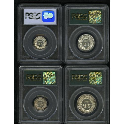 <B>PCGS certified Specimen lot including:</B></I> 1/2 Franc 1945B, Specimen 66; 1/2 Franc 1946B, Specimen 66; 1 Franc 1956B, Specimen 67; and a 2 Francs 1940B, Specimen 66.
