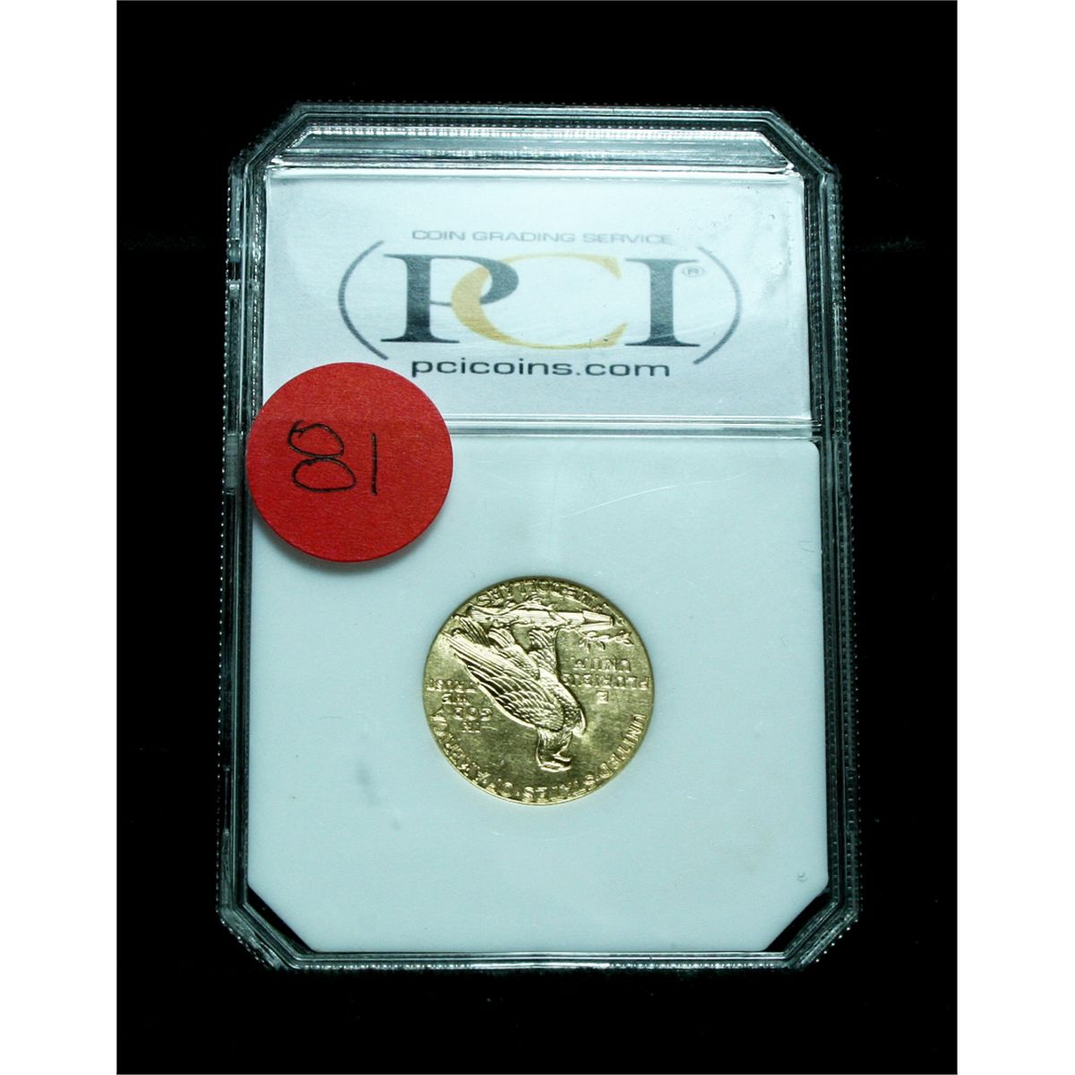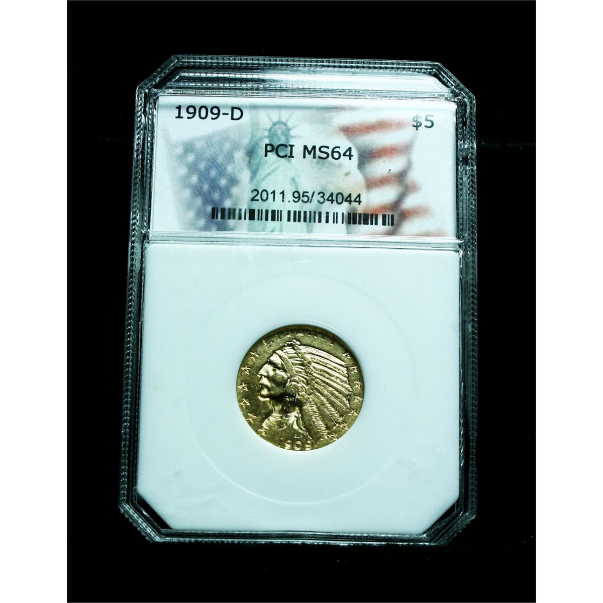 A Beautiful example with Great Luster. The $2 1/2 and $5 Gold Indian are the first incuse designed coins since ancient times. A Great Example of a $5 Gold Indian. It is graded by PCI, which is listed as a recognized professional grading company by the Greysheet and is listed on the cover of every issue along with PCGS and NGC. PCI Was Established in 1989 and is one of the oldest grading companies. NGC's Price Guide lists an ms64 at $3950. The Wholesale Greysheet lists an ms64 at $3170+. Estimated Value $3500.