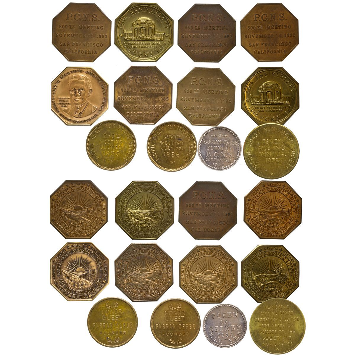 Bill Weber's collection of 12 tokens issued by the Pacific Coast Numismatic Society, including seven slug facsimiles. - Weber Collection
