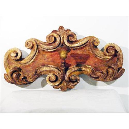 An lovely pair of ornately carved Italian One Arm Leaf Sconces. These large wooden sconces are red with gold trim. Wonderfully solid candleholders. More photographs available upon request.