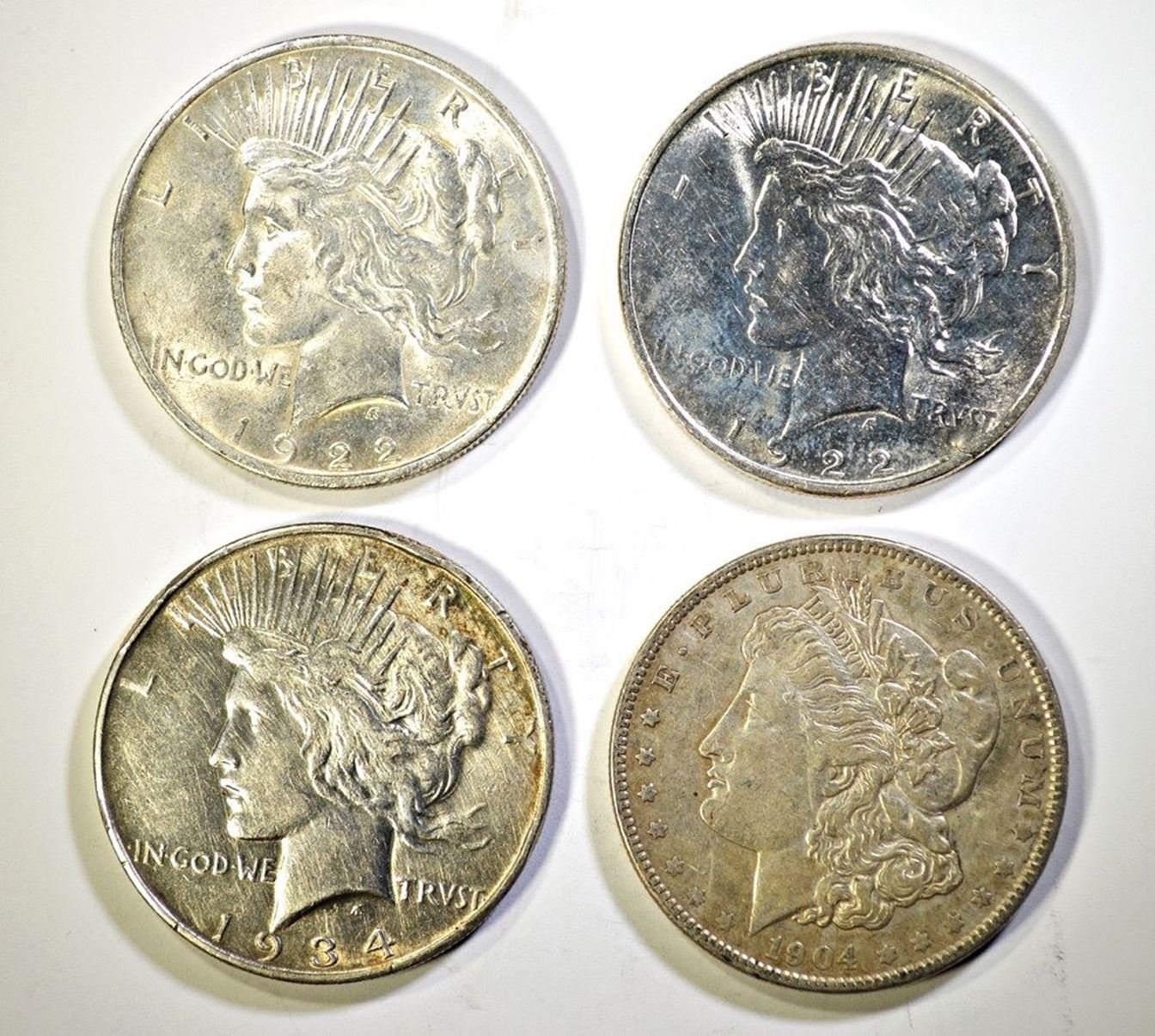 1904 MORGAN AU, 2-1922 PEACE BU & 1934-D XF/AU ESTIMATE $150 - $175.