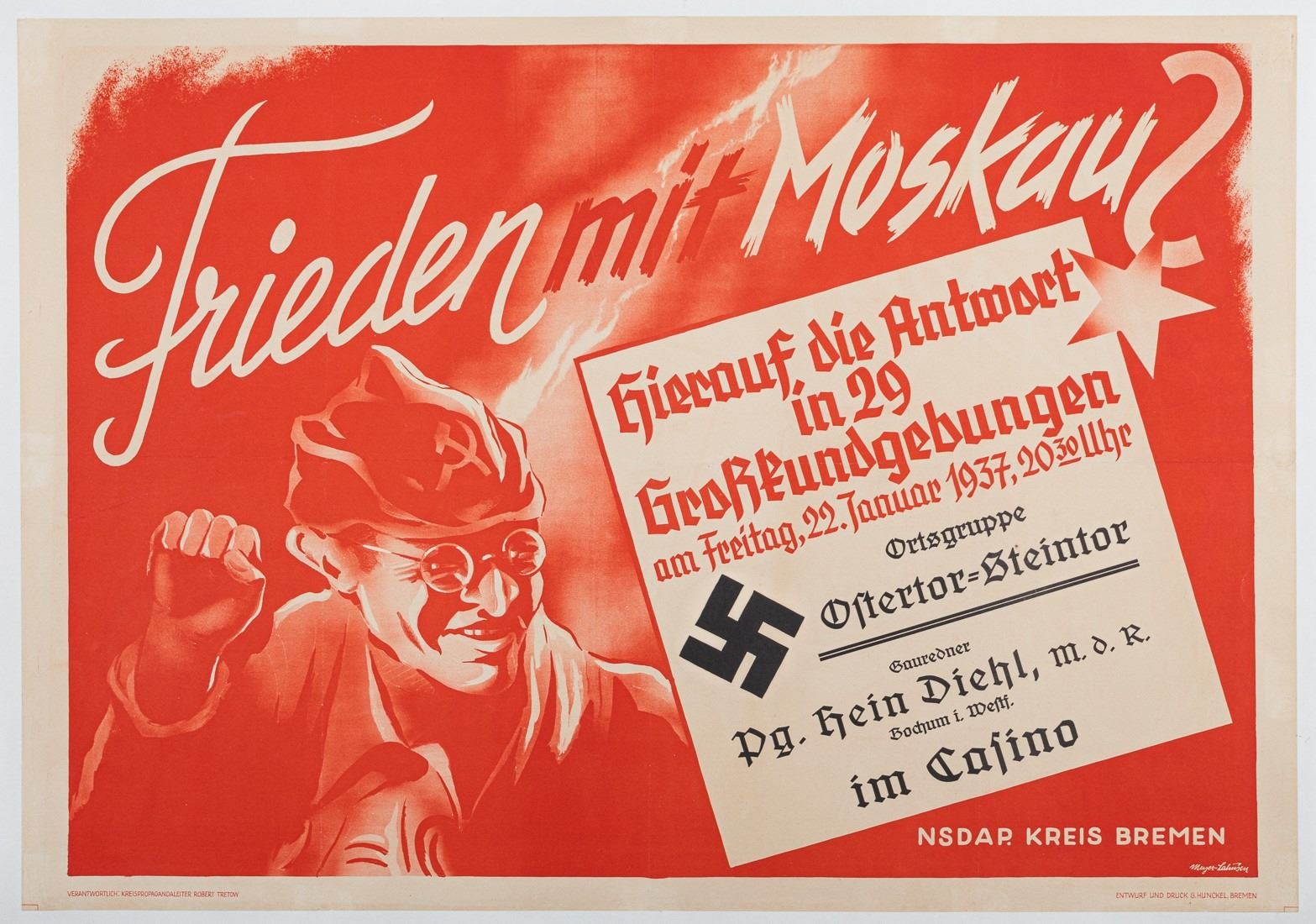 Scarce Third Reich Nazi propaganda poster from 1937 announcing a mass rally titled 'Peace with Moscow? We give you the answer in 29 big rallies.' Published by the NSDAP Bremen District, featuring propaganda leader Robert Tretow as the speaker at the rally. Designed and printed by Hunckel, Bremen, 1937, 24 x 34 inches. Linen-backed.