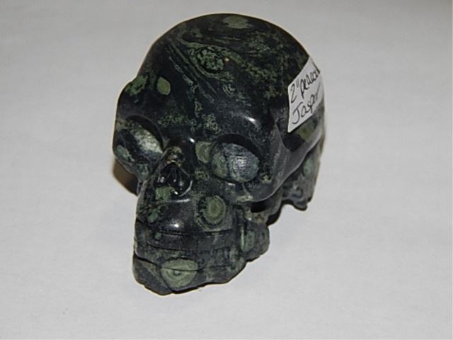 PEACOCK JASPER CARVED SKULL - 2" = 448 CARATS