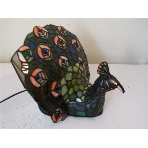 This is a beautiful leaded glass lamp "THE PEACOCK LAMP." The peacock's wing spread is nine and three fourths wide at the widest point, the lamp is nine and three-fourths tall. This is a very beautiful table lamp, works beautifully, and is in very good condition. <P> The lamp uses a 25 watt bulb. <P> I do not know the age of this lamp nor the maker.